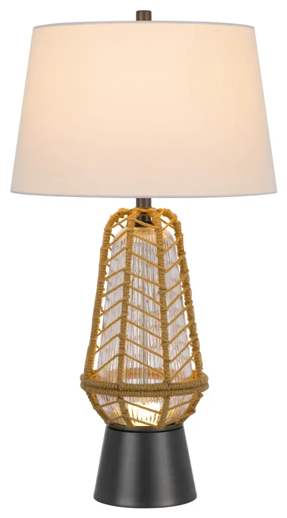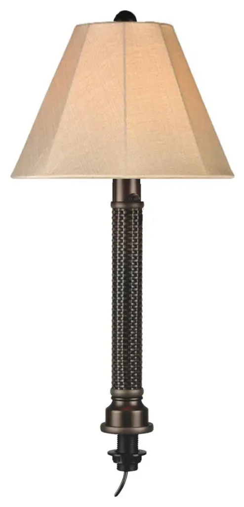 Patio Living Concepts TL-19257 Tahiti II 34" Table Lamp 19257 with 3" bronze tube body and tight weave, flat wicker, stone shade. All-weather full woven pattern, using flat PVC wicker highlights this shade, which completes the acrylic light globe in this elegant outdoor lamp. Features weatherproof all resin construction with heavy weighted base, two level dimming switch and 13 ft. weatherproof cord and plug. Waterproof light bulb enclosure allows the use of a standard 100 watt light bulb or comparable LED or CFL bulb. Dimension: 20Lx20Wx34H in.
