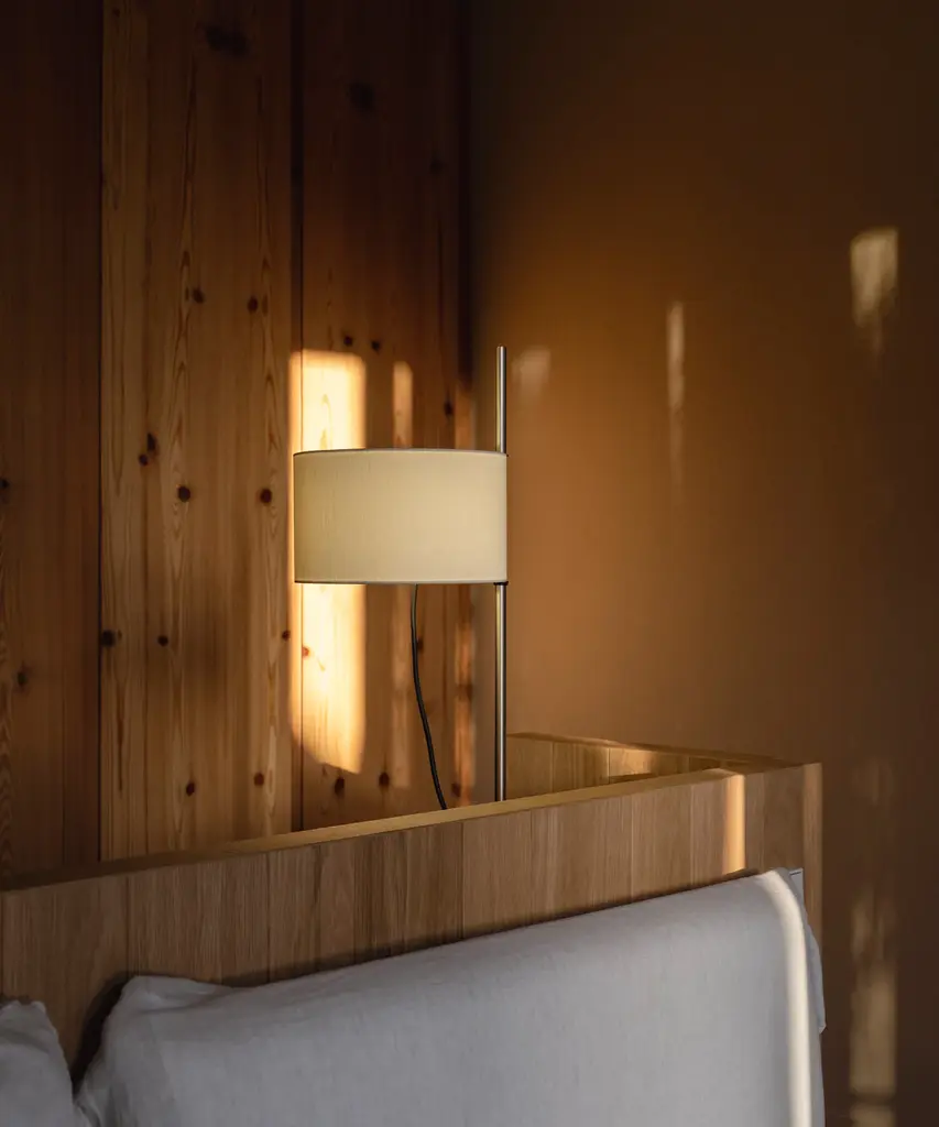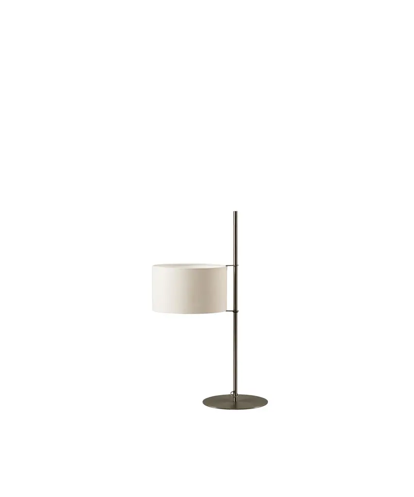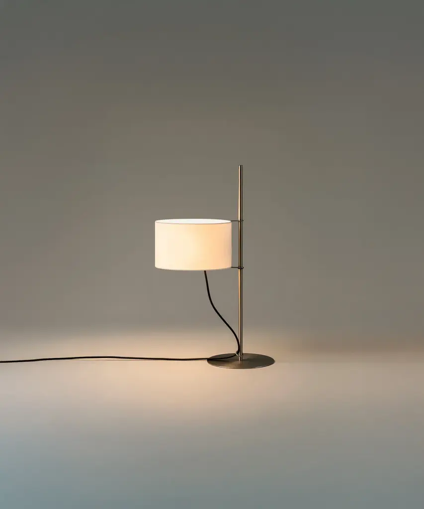 Based on his famous TMM lamp, Miguel Milá was commissioned to design the TMD version. The designer came up with the idea of a shade that is raised like a flag up a mast. To reduce the number of sections, he replaced wood with metal and the cross-shaped base with a circular one, taking up less space on a crowded desk. The elegant lampshade, made of white linen fabric, creates a warm ambient light. With this exquisite blend of materials, the TMD lamp adds warmth to any room, even with the light off. Produced by the Barcelona-based lighting purveyor, Santa & Cole.