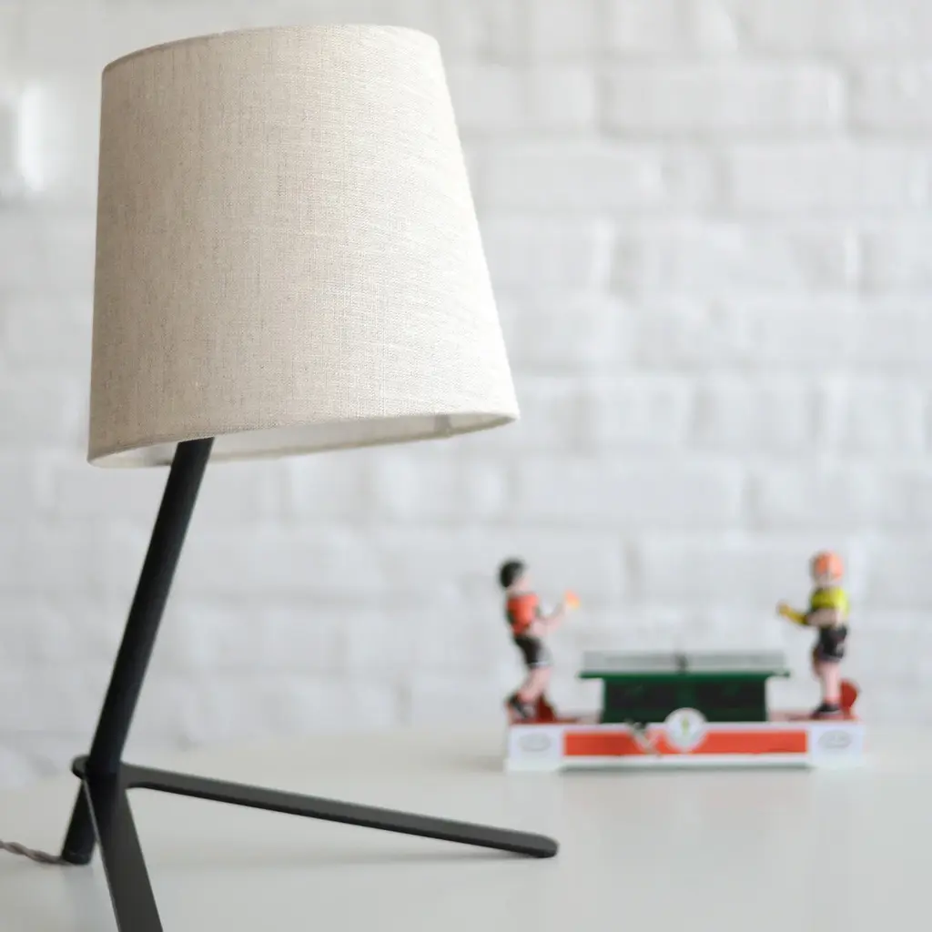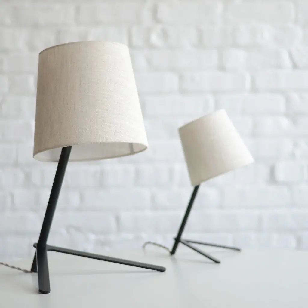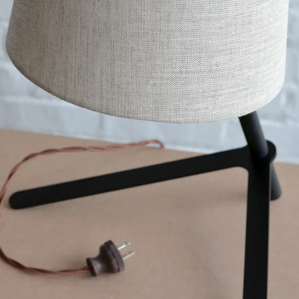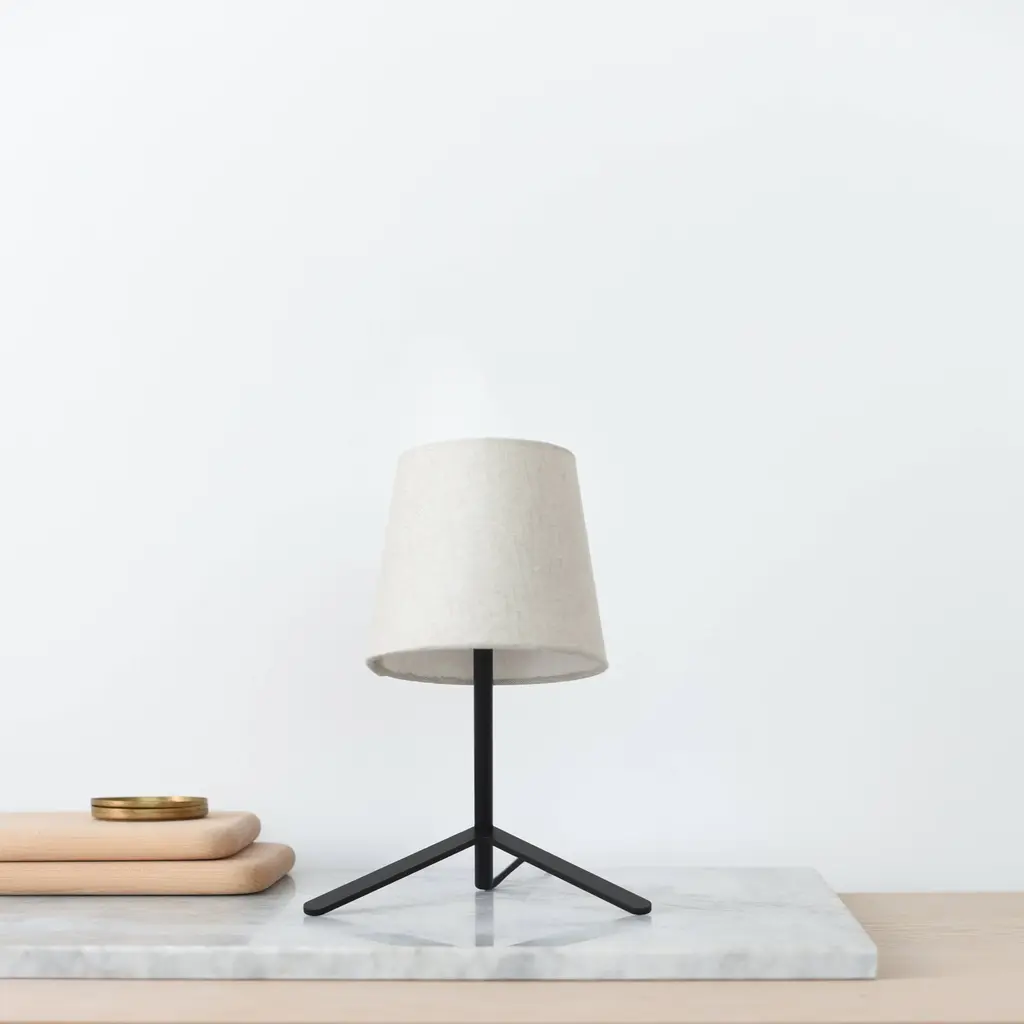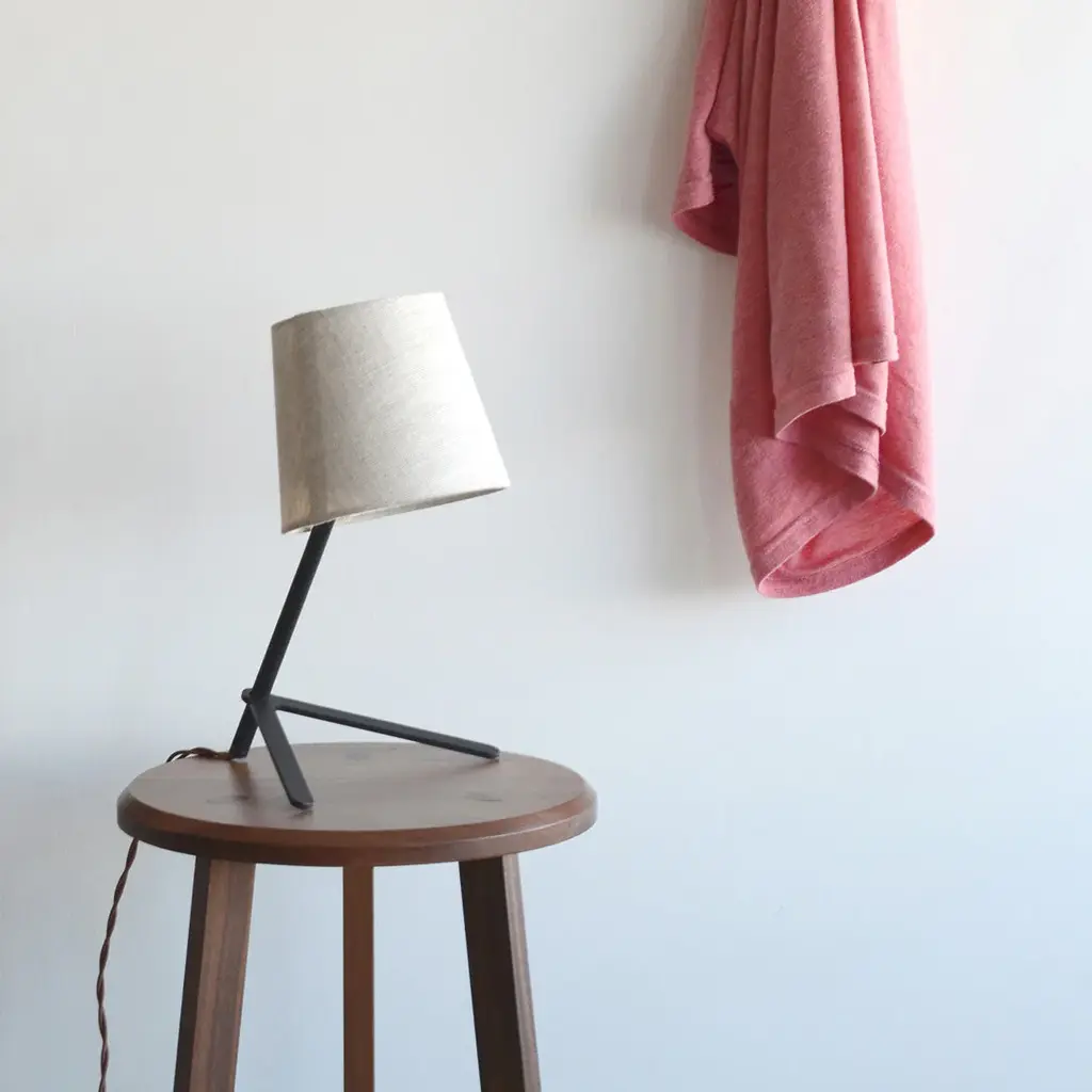 A most engaging little light, Tokyo I has an angled neck and legs made of recycled steel, capped with an oatmeal-colored, rolled-edge shade in natural, unbleached cotton The shade pivots and the neck angle can be adjusted to cast a warming glow wherever it's desired. With its petite stance, the lamp fits easily on a shelf but also looks great on a desk, table or dresser.