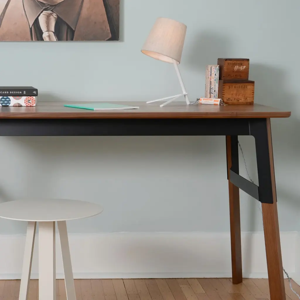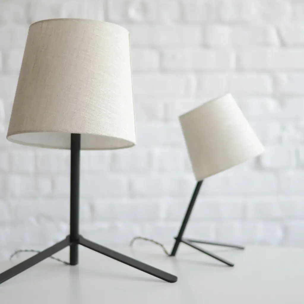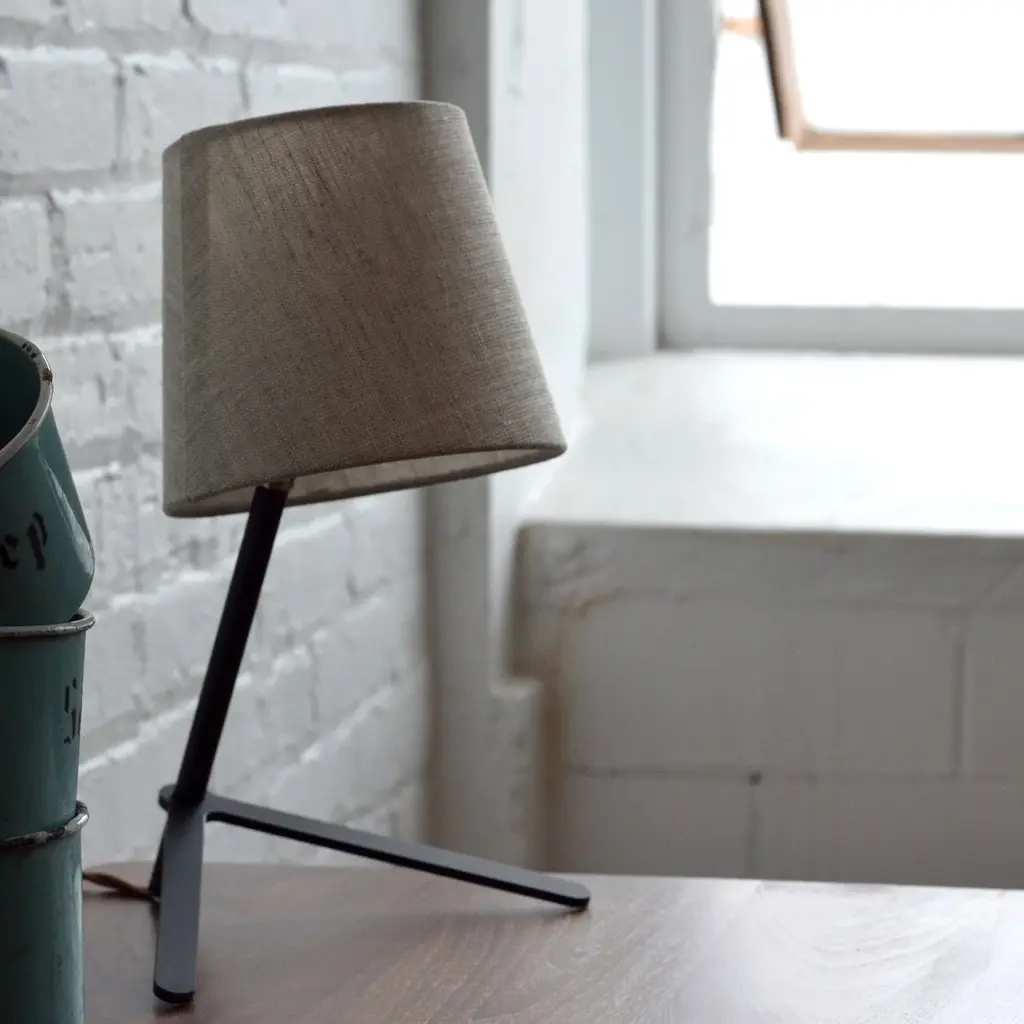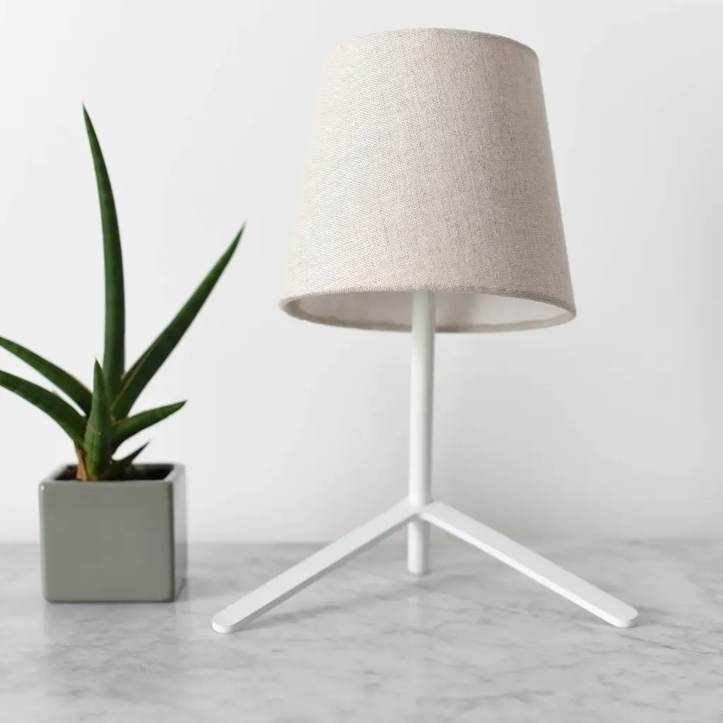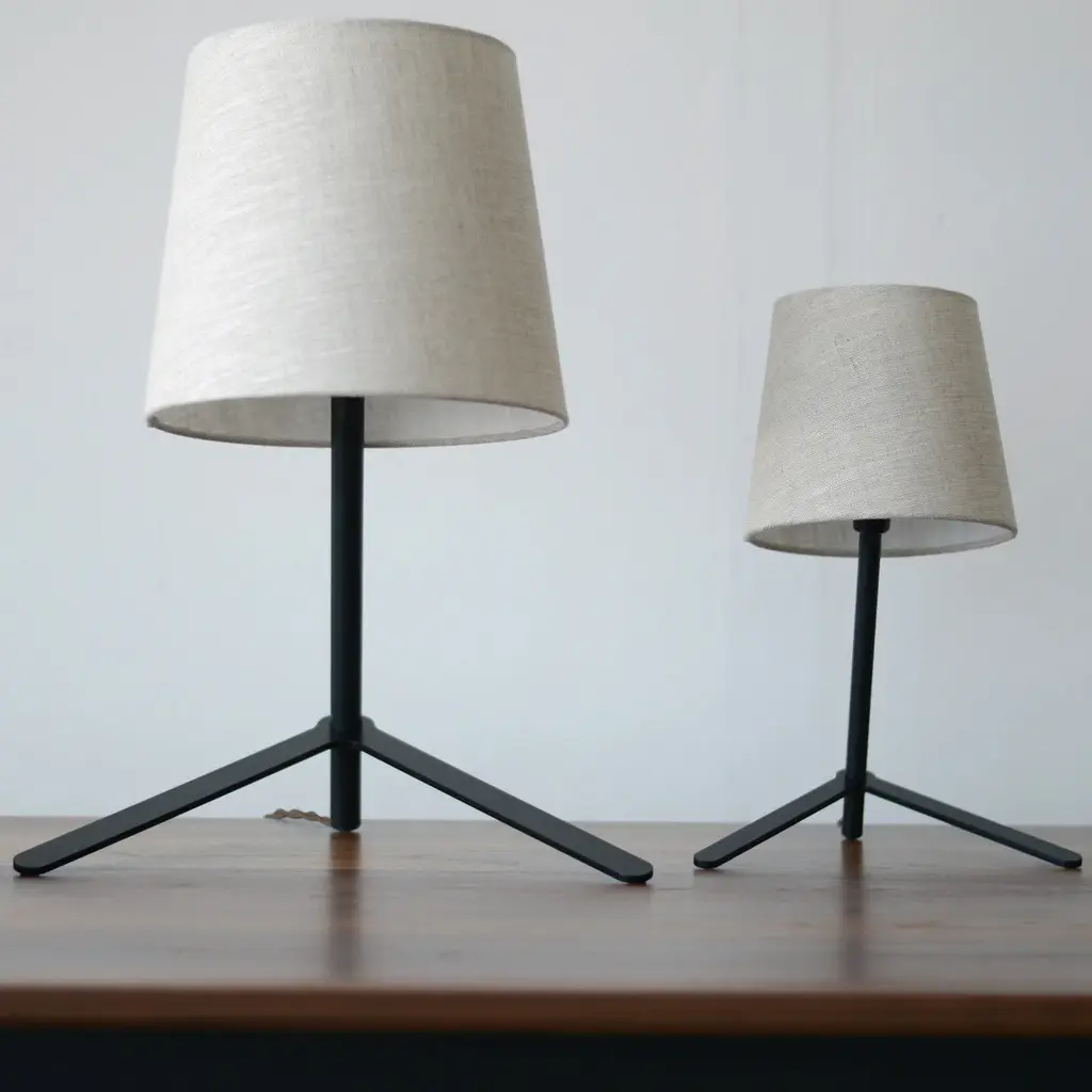 A most engaging little light, Tokyo I has an angled neck and legs made of recycled steel, capped with an oatmeal-colored, rolled-edge shade in natural, unbleached cotton The shade pivots and the neck angle can be adjusted to cast a warming glow wherever it's desired. With its petite stance, the lamp fits easily on a shelf but also looks great on a desk, table or dresser.