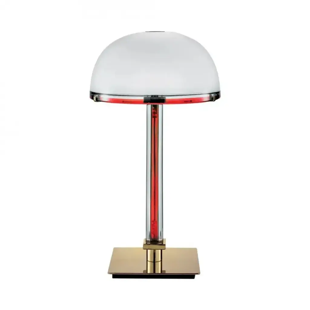 Now considered classics of modernity, the Belboi, Tolboi and Stillboi models making up this collection have enjoyed uninterrupted success since the first edition. These lamps fit perfectly into traditional, modern and contemporary environments. Table lamp consisting of an opaline glass diffuser with coloured glass profile and crystal stem with coloured core. The base and structure are in goldplated metal.