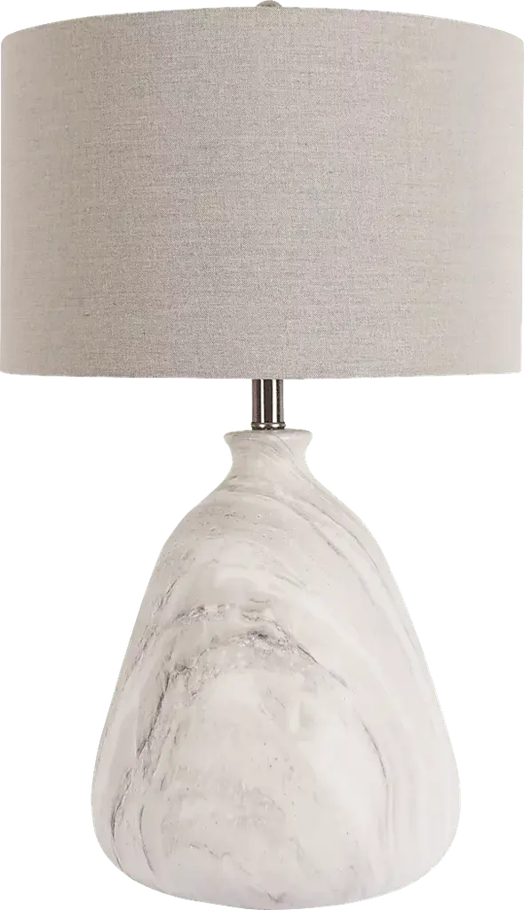 A sophisticated, naturalistic style comes home with the Toledo Circle table lamp, a statement piece that showcases a ceramic body with a gray and white marble finish for a distinctly modern look. The circular gray shade softly filters the light, while also complementing your space. It features a three-way switch and 75-watt bulb capacity that can be tailored to meet your lighting needs and elevate your space.