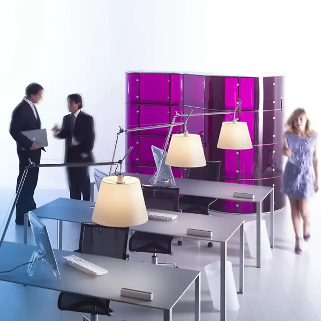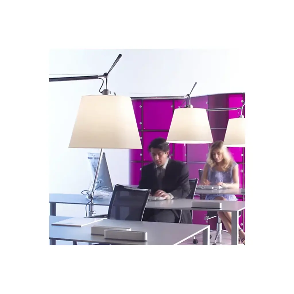 The Artemide Tolomeo with Shade Table Lamp combines the look of the traditional lamp shade with the modern technology of fully adjustable, bright task lighting. Designed by Michele De Lucchi and Giancarlo Fassina, the Tolomeo design received the Compasso d'Oro award in 1989 for Italian Industrial Design.
