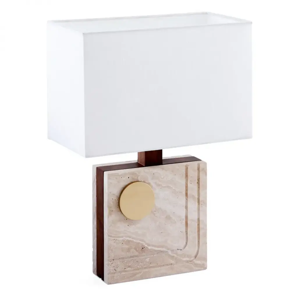 Cali Mod.Rich materials meet modern shapes in our Topanga lighting. Featuring a square travertine stone and warm walnut base fixed with a circular antique brass accent. Travertine, with its signature natural tones, is the stone du jour—warm, full of character, and with just the right amount of je ne sais quoi. Topped with a white linen shade, our Topanga Column Table Lamp is a natural on any surface.All lighting sales are final