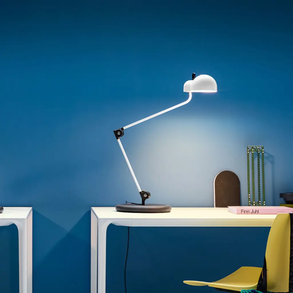 Topo is a fascinating object of automotive inspiration: the slits on the metal shell are reminiscent of the vents on a 1960s sports car, whilst the lampshade’s form corresponds to the casing of the classic E27 bulb it contains like the bodywork encasing an engine. The jointed metal arms allow the lamp to be extended or retracted at will. Metal base with external polyethylene finish or with an aluminum screw clamp. Single-emission table lamps for indoor application.