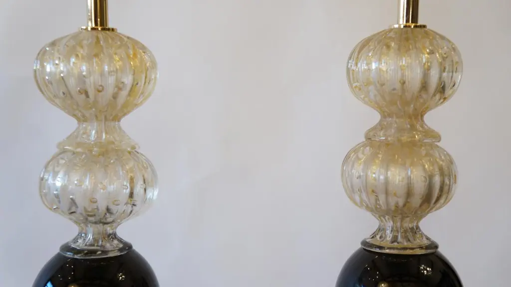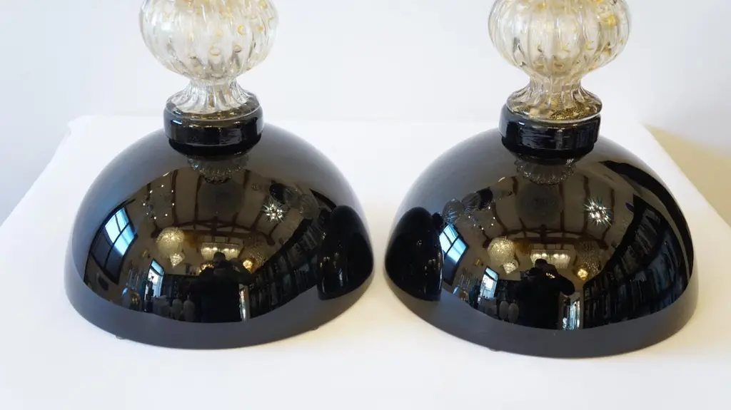 Toso Murano Mid-Century Modern Gold Black Two Murano Glass Table Lamps, 1982