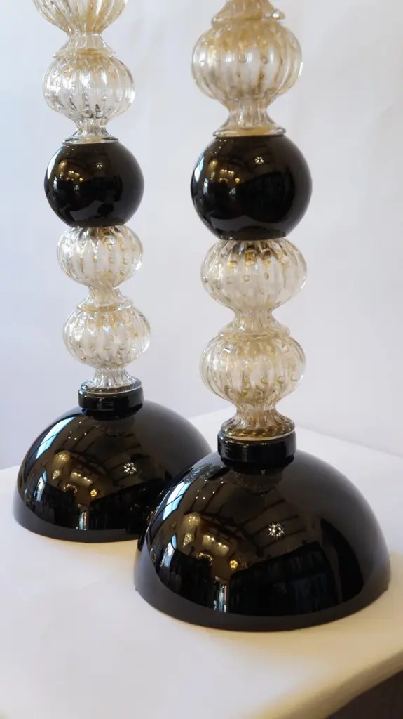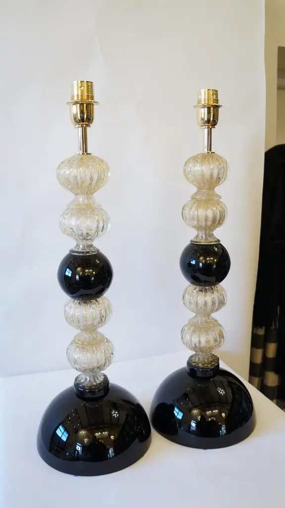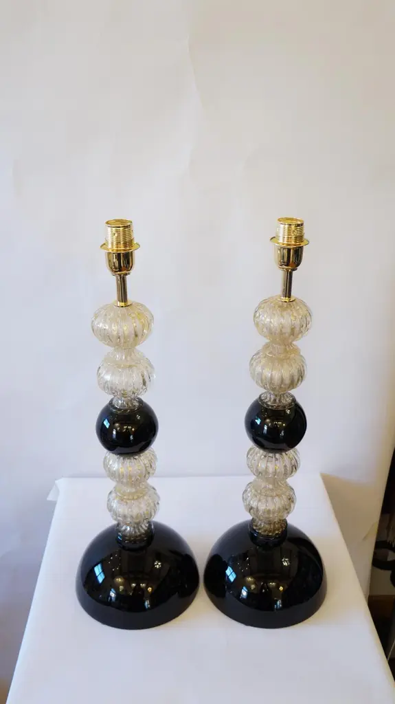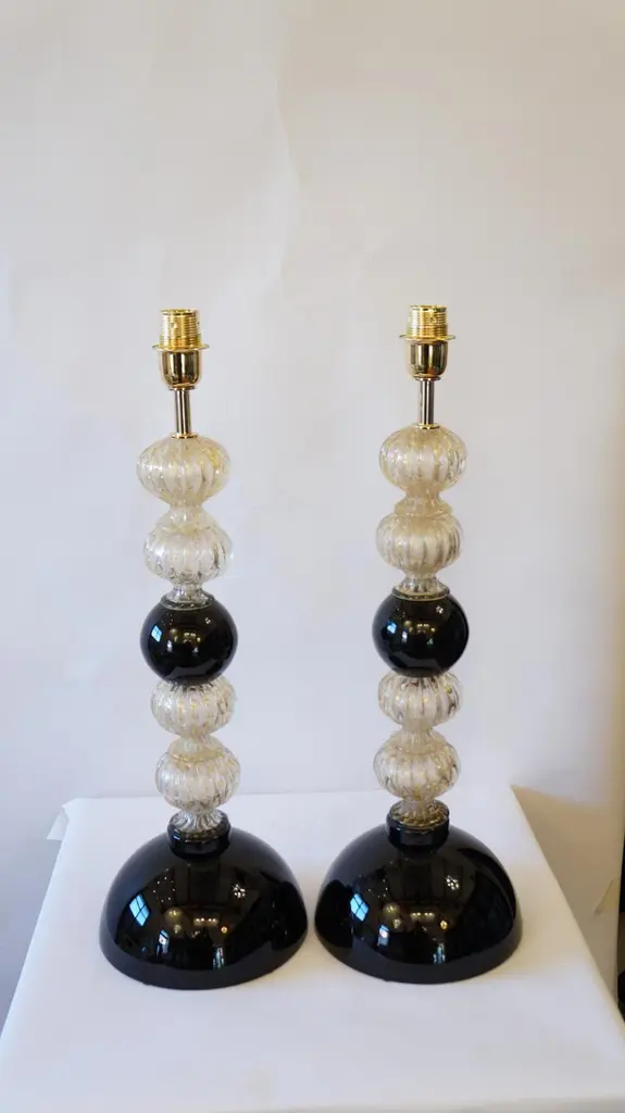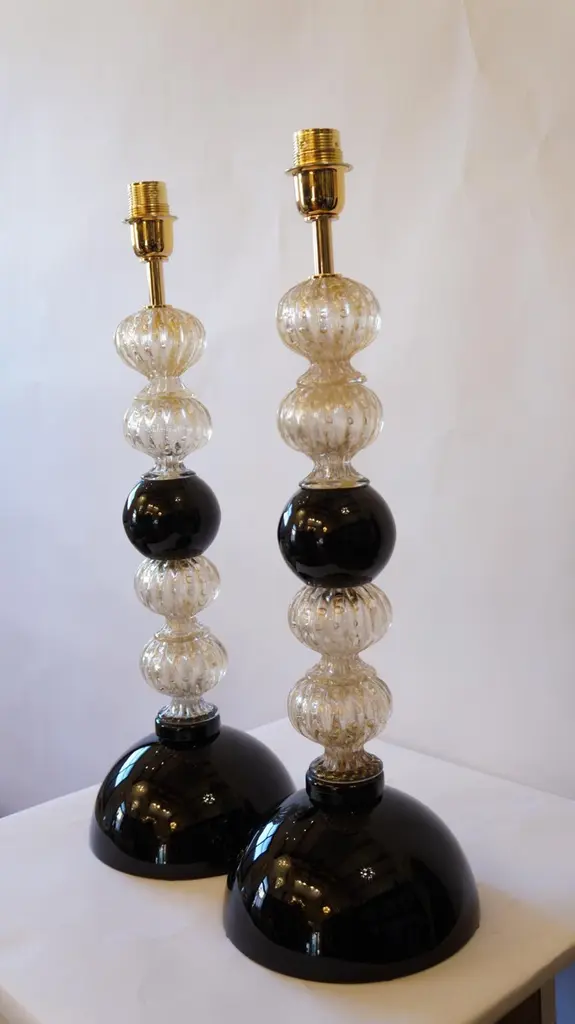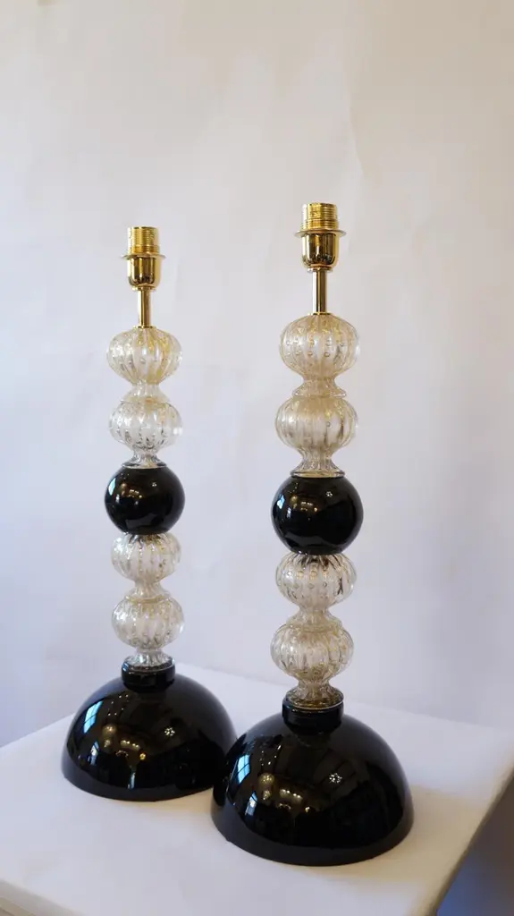These are elegant Murano glass lamps, the ones you see pictured. They were designed for the first time in 1982 by Toso Murano and are magnificent. They are composed of four spherical elements that follow each other divided by ball black. The spheres themselves are made with the technique of "ribs" and 24k gold. The lamps are, at first glance, elegant and fine. Surely they can be defined as a must of vintage.Designed by Toso Murano in 1982The products are entirely handmade in style Mid-Century ModernThe price of the item includes professional and tailored packing.Lamps can be rewired for your country code.