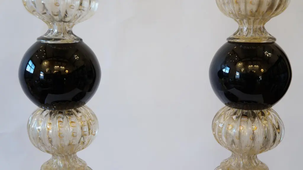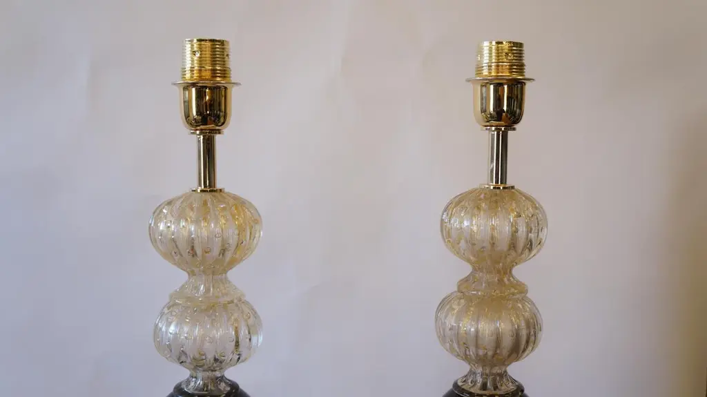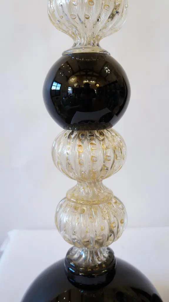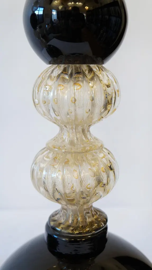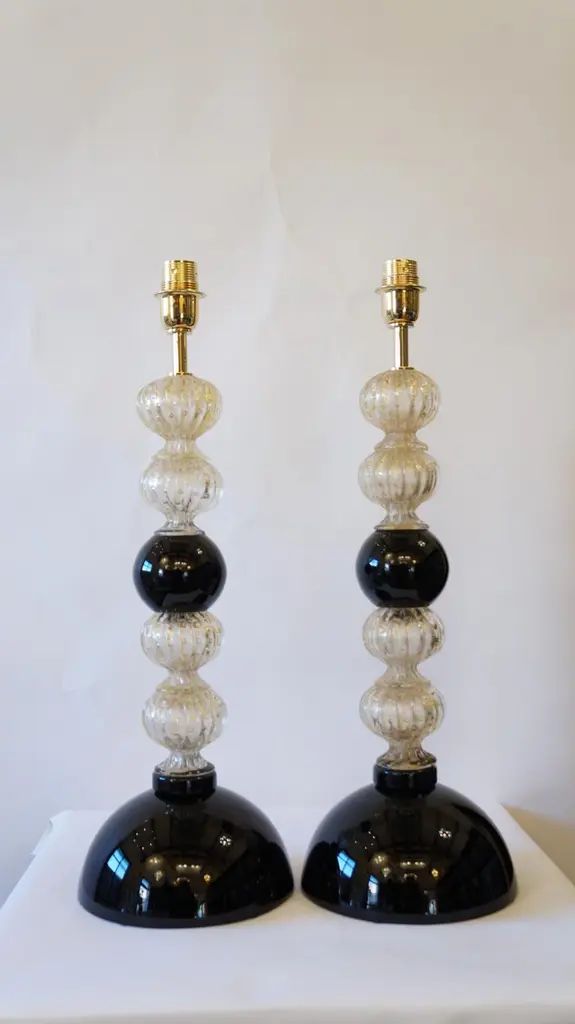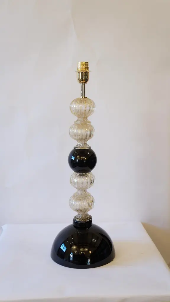 These are elegant Murano glass lamps, the ones you see pictured. They were designed for the first time in 1982 by Toso Murano and are magnificent. They are composed of four spherical elements that follow each other divided by ball black. The spheres themselves are made with the technique of "ribs" and 24k gold. The lamps are, at first glance, elegant and fine. Surely they can be defined as a must of vintage.Designed by Toso Murano in 1982The products are entirely handmade in style Mid-Century ModernThe price of the item includes professional and tailored packing.Lamps can be rewired for your country code.