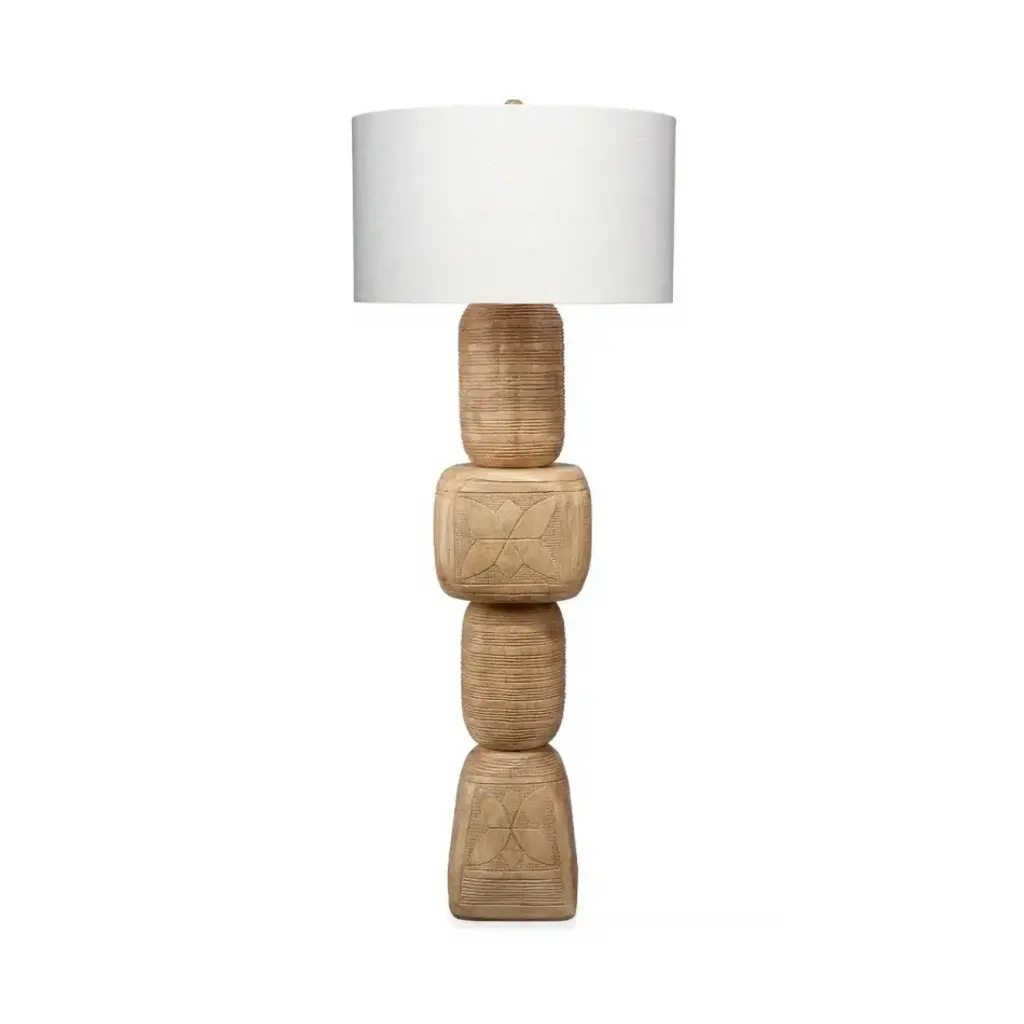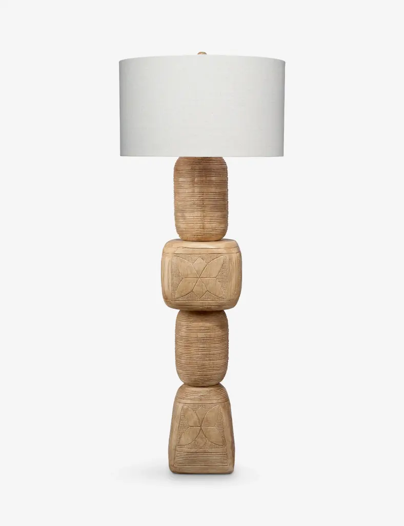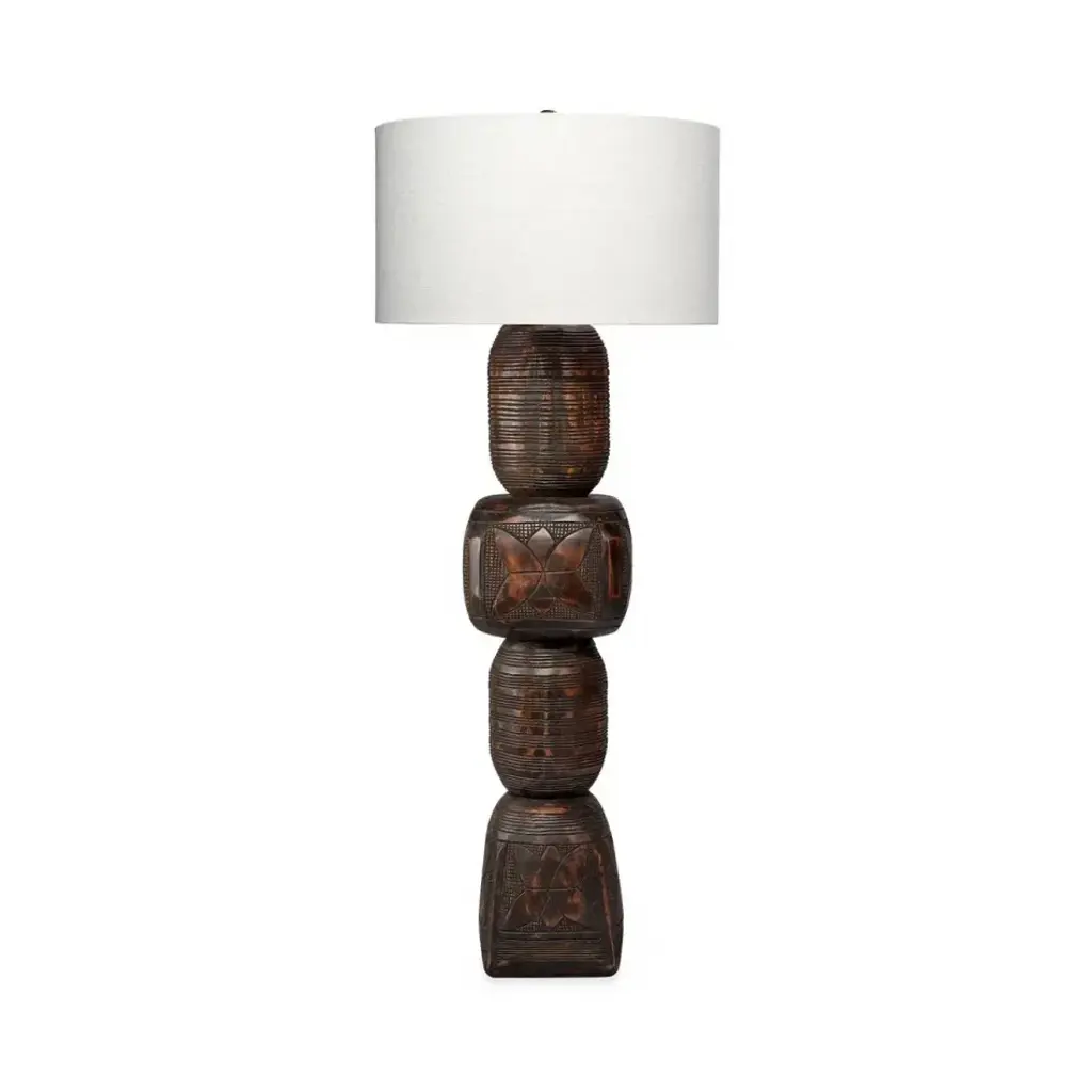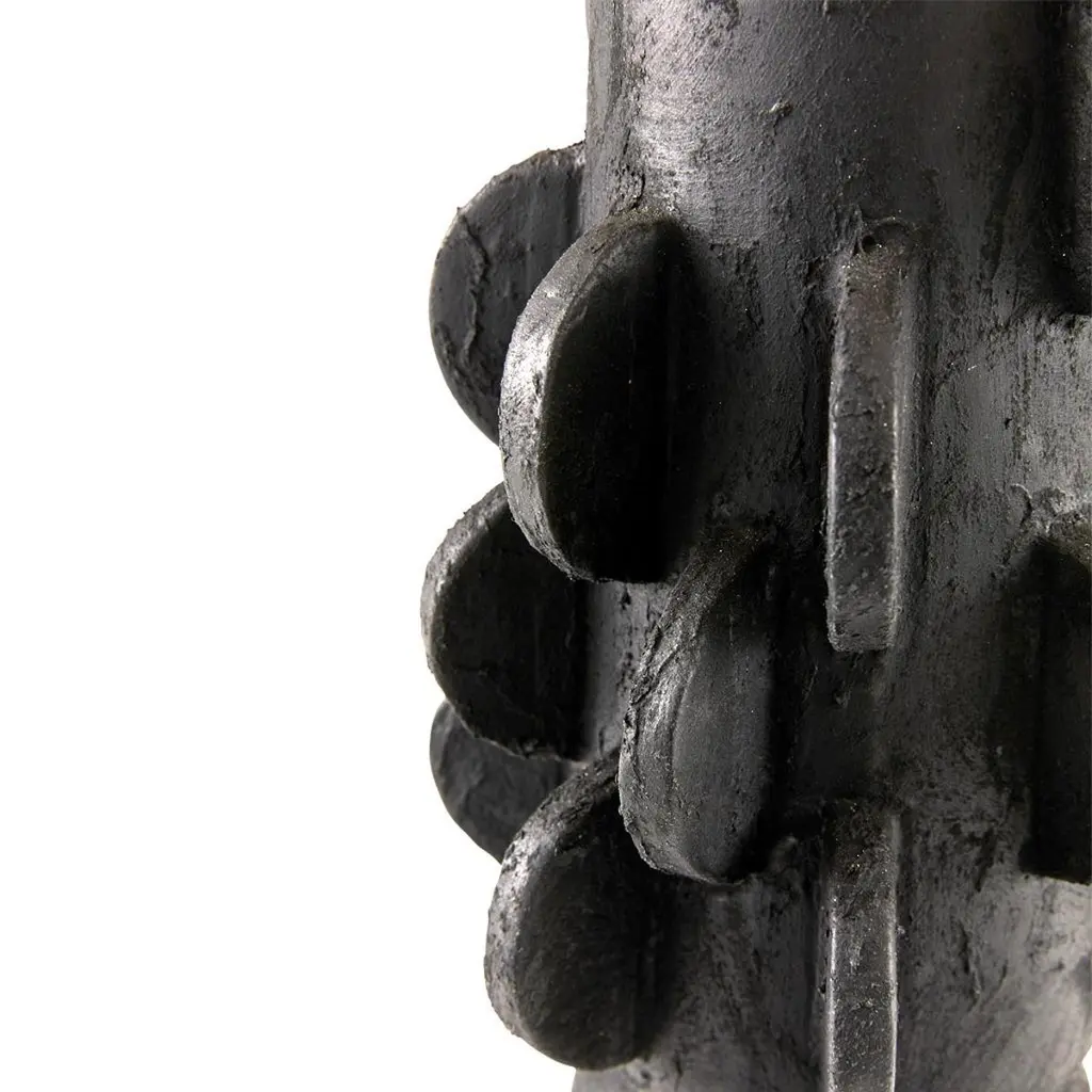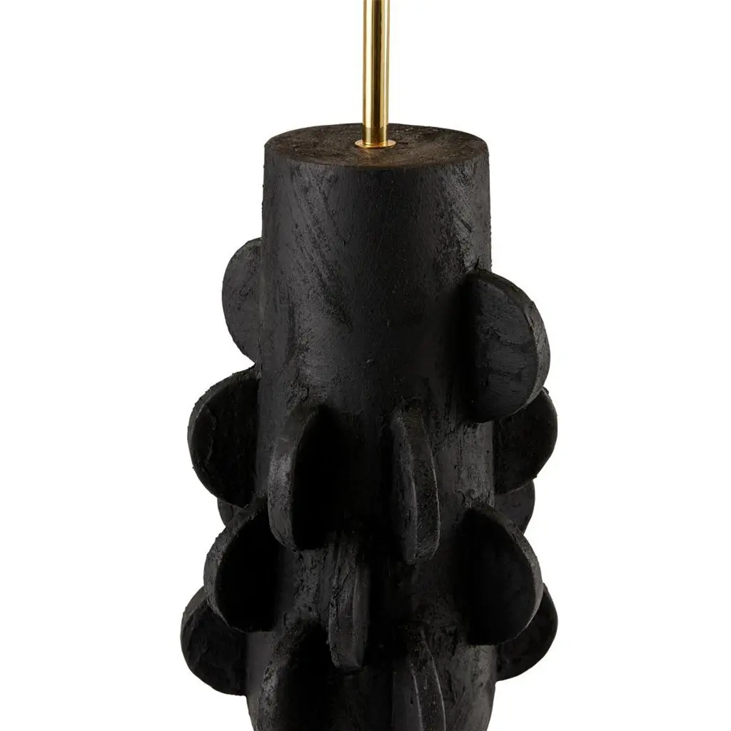 The Totem lamp collection is inspired by Brutalist forms. Each piece is finished with hand applied details which gives it a hand crafted aesthetic. The terracotta base is finished in textured black Jesmonite plaster, once gain applied by hand so that each piece is individual.The Totem lamps are tall at 94CM which give them a strong sculptural presence in a room especially when displayed as a pair.The ceramic base is paired with a shaped raffia shade and polished brass stem.The beauty of this lamp is that it complements most styles, it can live equally well in a natural, minimal, mid century modern or African inspired interior. There are 2 color options, black or white, for larger orders we can customize a color.
