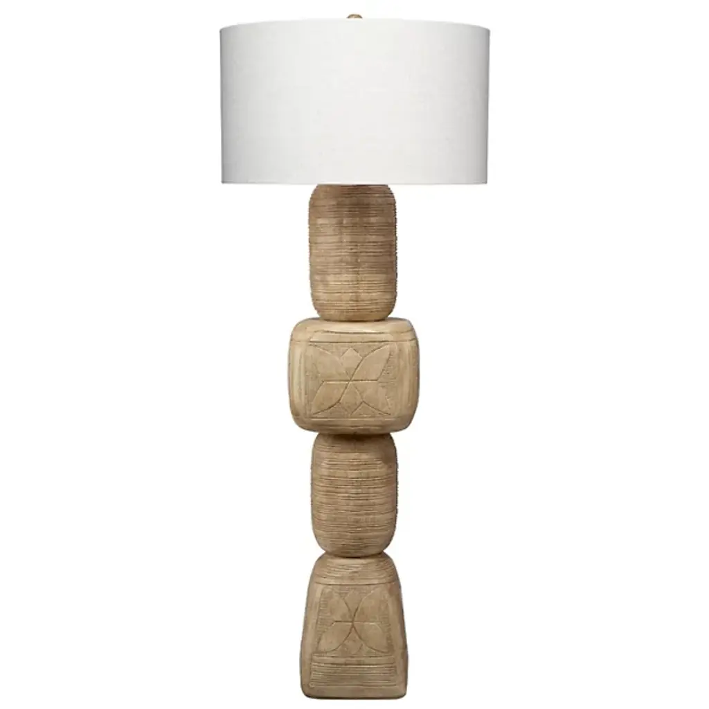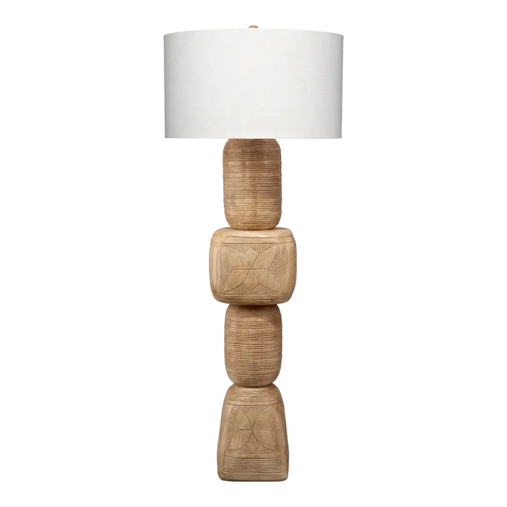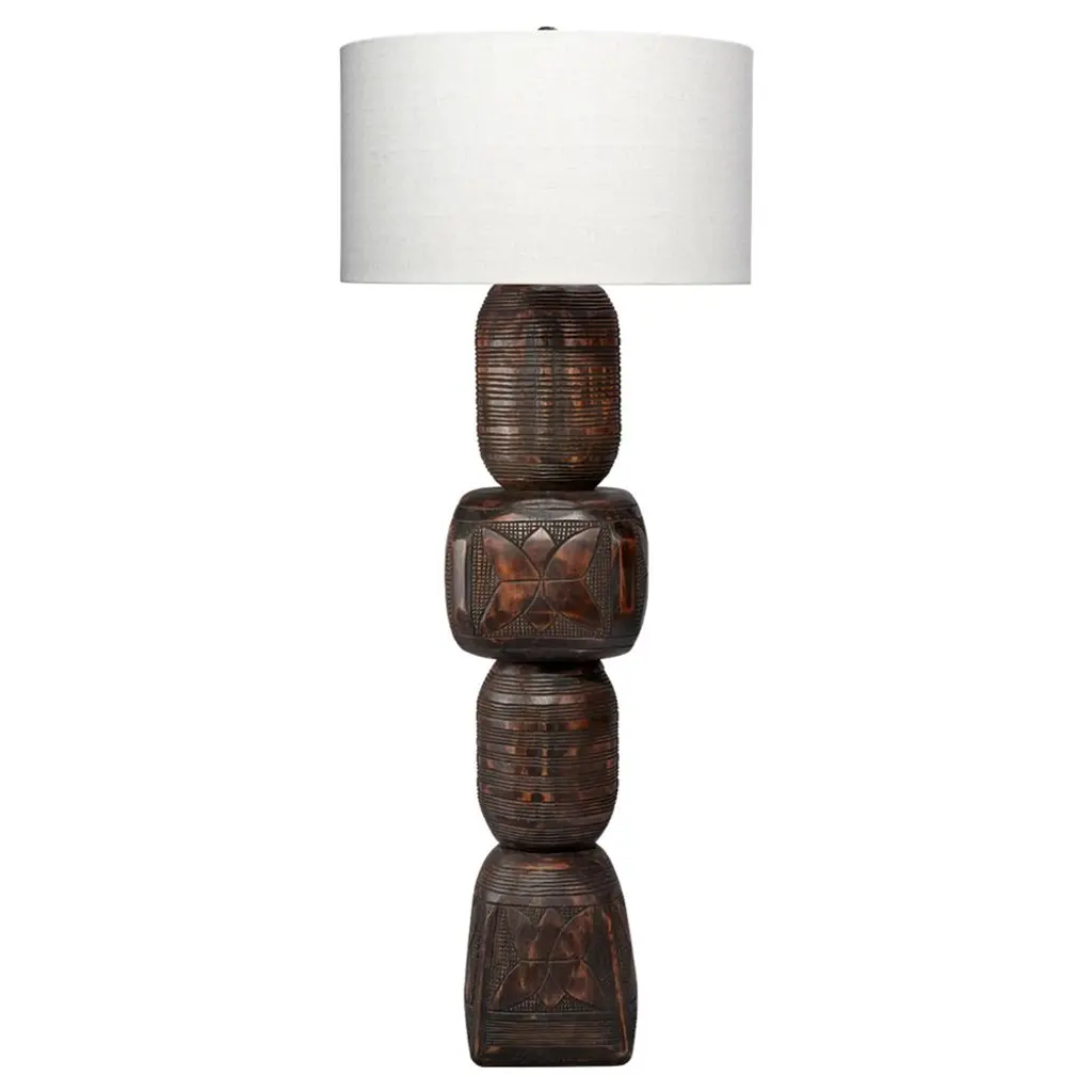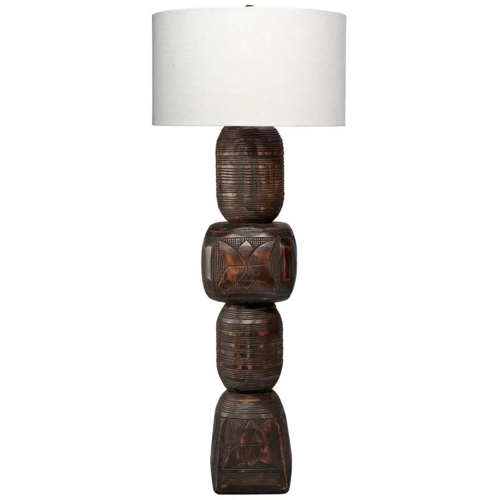 The Totem lamp collection is inspired by Brutalist forms. Each piece is finished with hand applied details which gives it a hand crafted aesthetic. The terracotta base is finished in textured black Jesmonite plaster, once gain applied by hand so that each piece is individual.The Totem lamps are tall at 94CM which give them a strong sculptural presence in a room especially when displayed as a pair.The ceramic base is paired with a shaped raffia shade and polished brass stem.The beauty of this lamp is that it complements most styles, it can live equally well in a natural, minimal, mid century modern or African inspired interior. There are 2 color options, black or white, for larger orders we can customize a color.