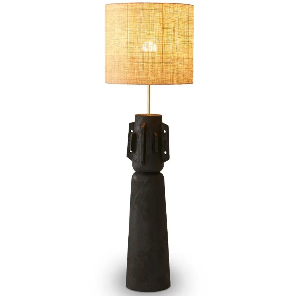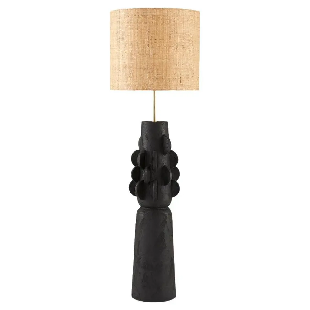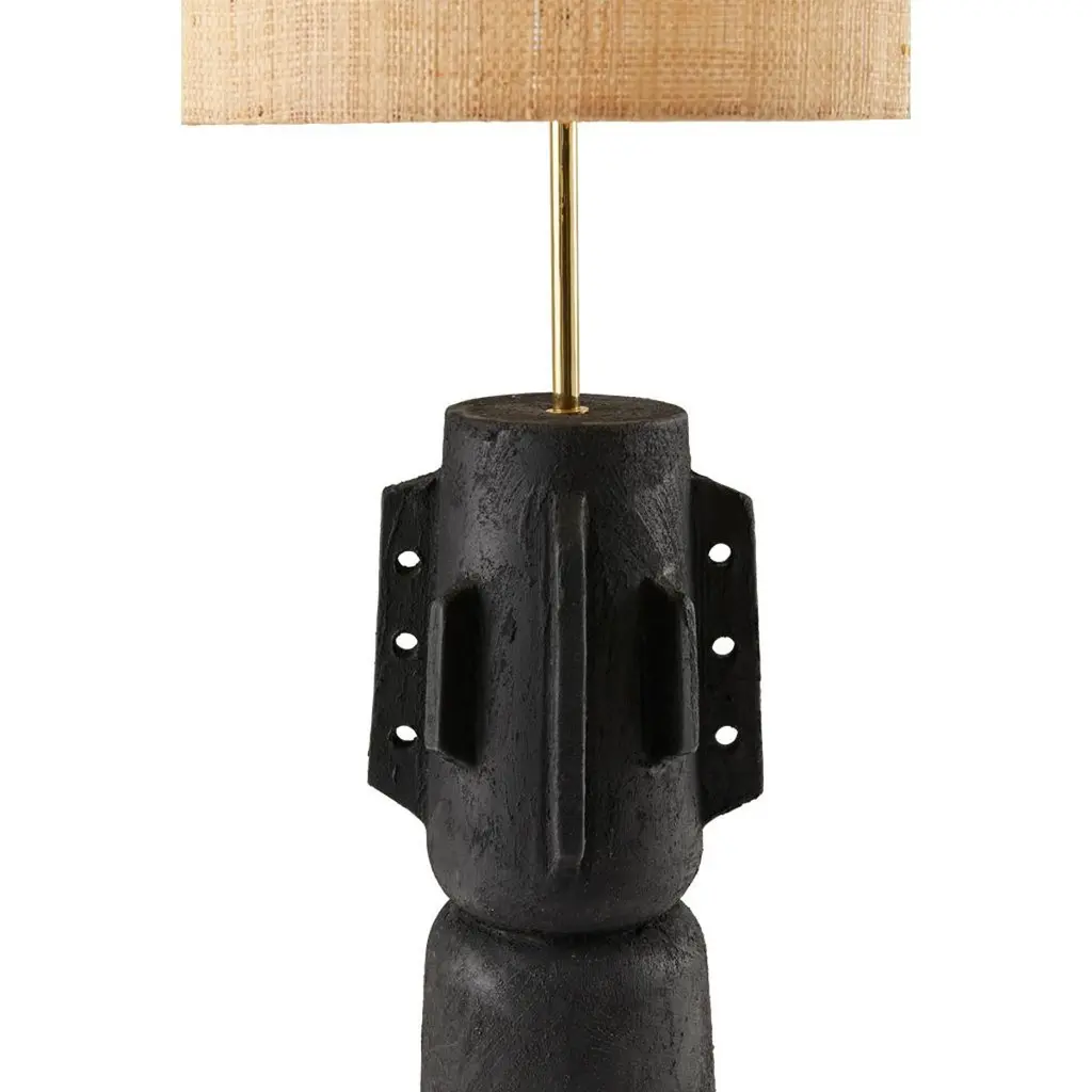 The Totem lamp collection is inspired by Brutalist forms. Each piece is finished with hand applied details which gives it a hand crafted aesthetic. The terracotta base is finished in textured black Jesmonite plaster, once gain applied by hand so that each piece is individual.The Totem lamps are tall at 94CM which give them a strong sculptural presence in a room especially when displayed as a pair.The ceramic base is paired with a shaped raffia shade and polished brass stem.The beauty of this lamp is that it complements most styles, it can live equally well in a natural, minimal, mid century modern or African inspired interior. There are 2 color options, black or white, for larger orders we can customize a color.