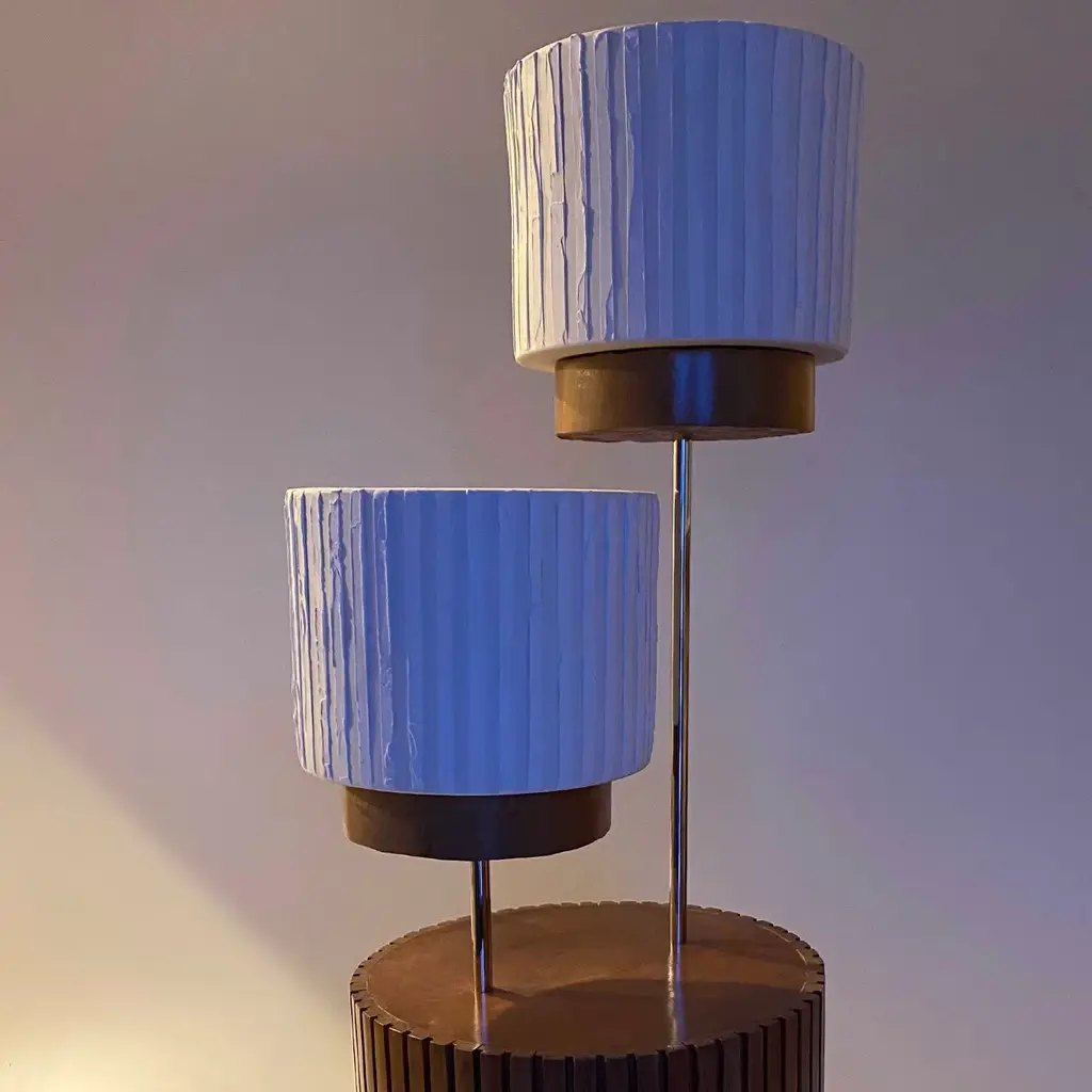 This sophisticated table lamp provides alluring illumination from its two cylindrical shades in off-white ceramic, minutely shaped on a lathe and decorated by hand with a channeled, uneven texture. The two metal rods supporting the shades at different heights extend from the cylindrical, footed base in solid cherry with a ridged design. Mascia Meccany numbers and signs each piece to guarantee its uniqueness.