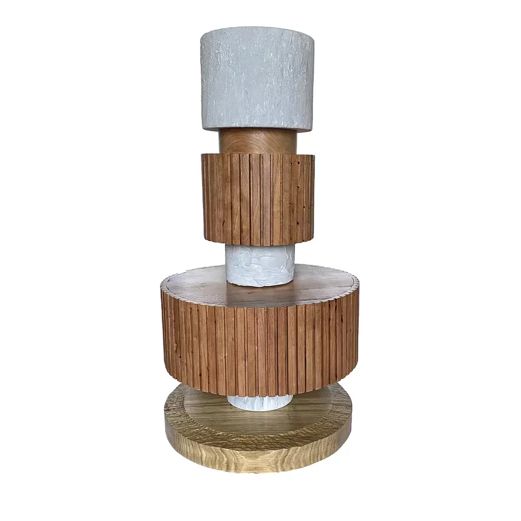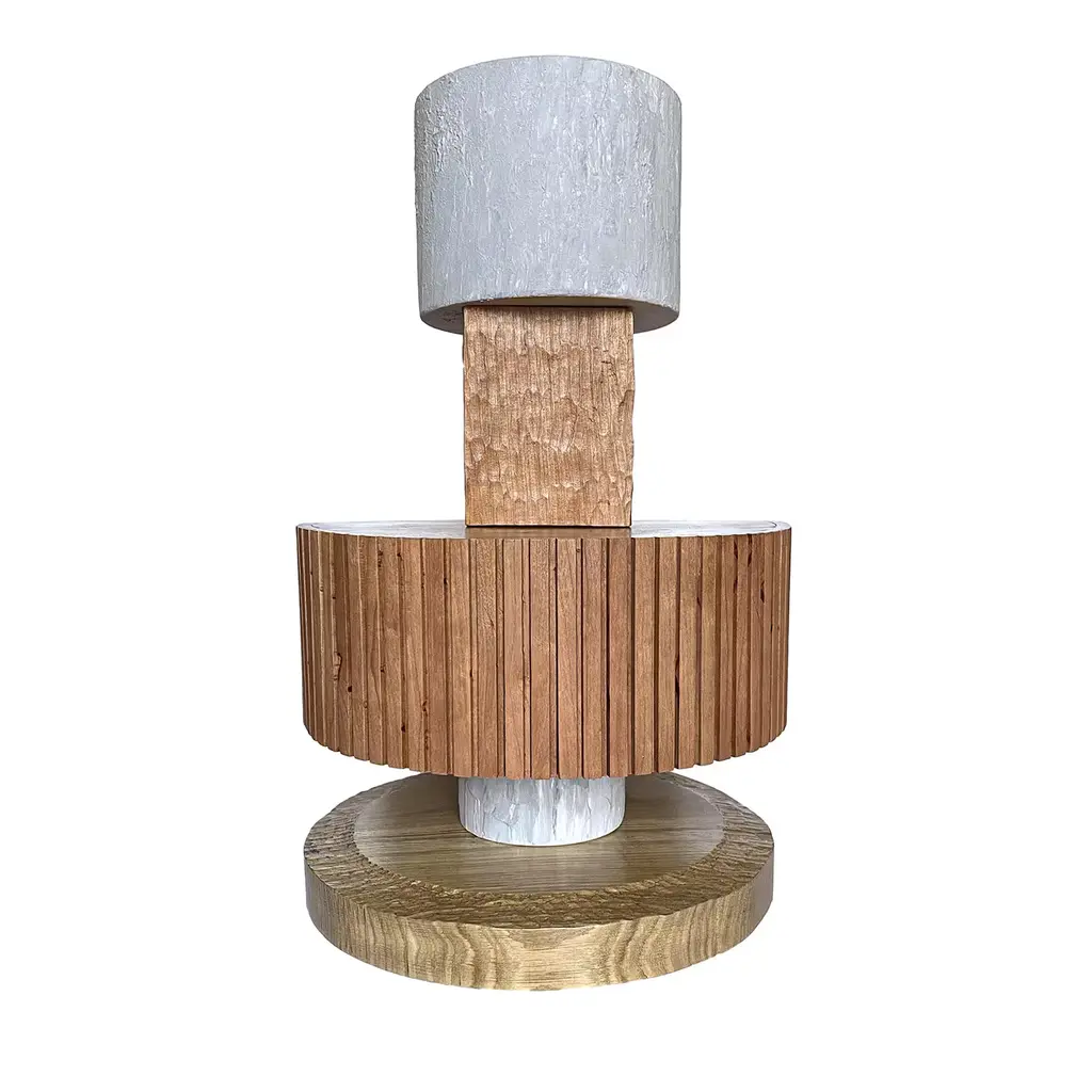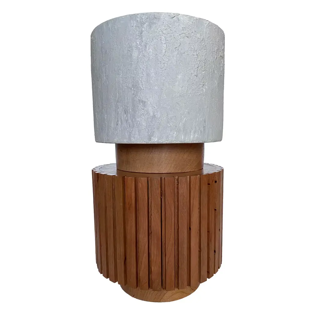 Available in multiple table and floor variants all inspired by totem poles, this handcrafted table lamp numbered and signed by Mascia Meccani displays a silhouette that is as compact as it is elegant. It consists of an interplay of cylindrical volumes, including the off-white ceramic shade, molded and decorated by hand to obtain its characteristic uneven texture. The supporting structure in solid cherry is encircled by a larger, central element enlivened by vertical grooves.