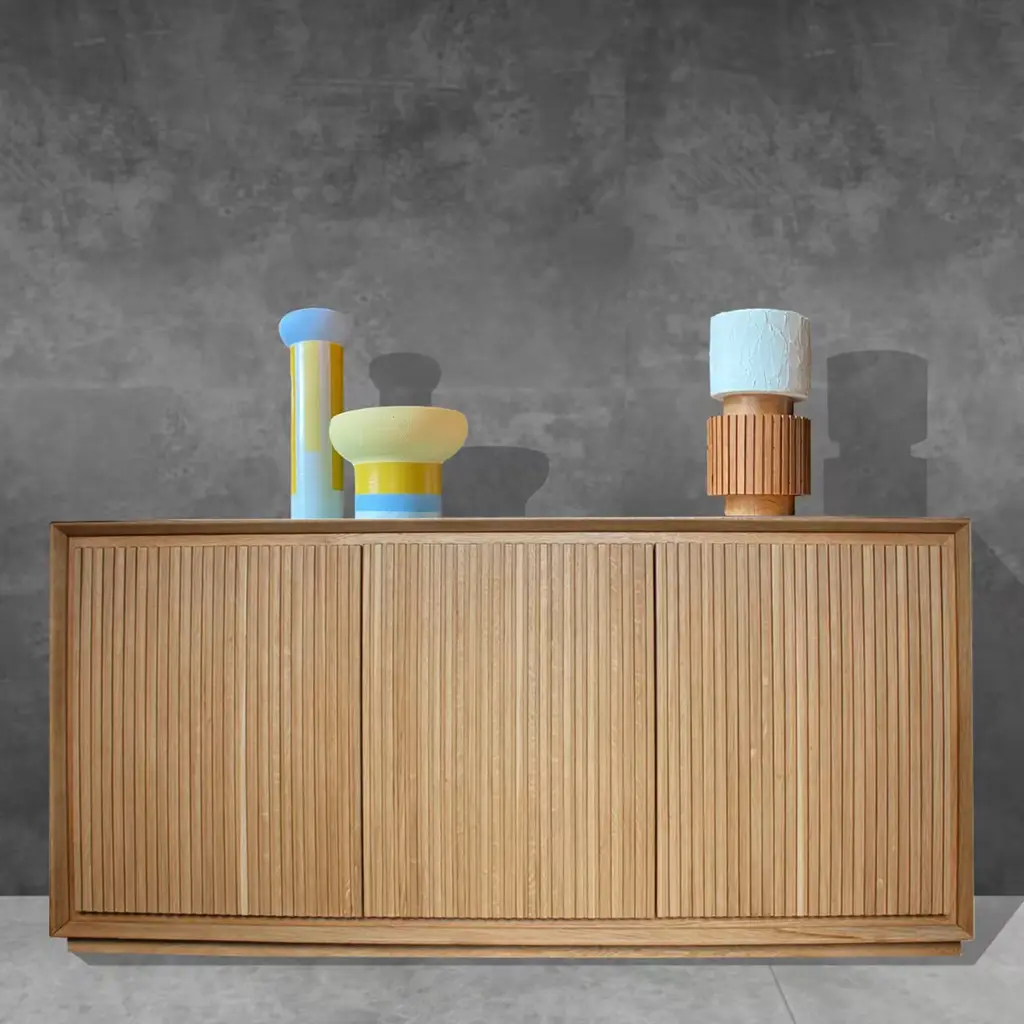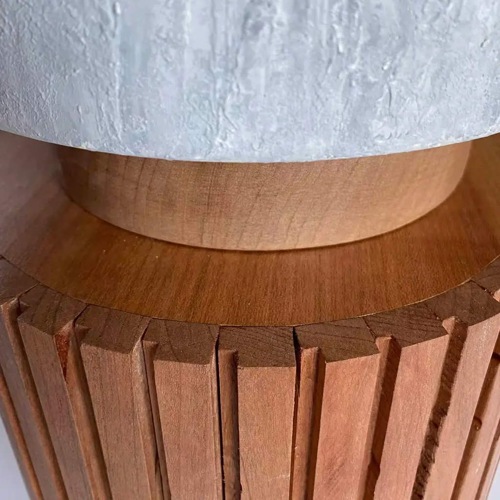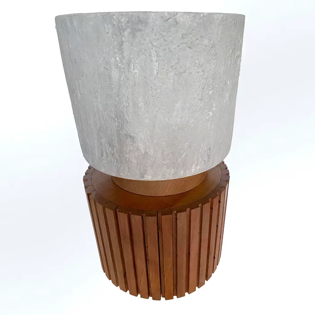 Available in multiple table and floor variants all inspired by totem poles, this handcrafted table lamp numbered and signed by Mascia Meccani displays a silhouette that is as compact as it is elegant. It consists of an interplay of cylindrical volumes, including the off-white ceramic shade, molded and decorated by hand to obtain its characteristic uneven texture. The supporting structure in solid cherry is encircled by a larger, central element enlivened by vertical grooves.