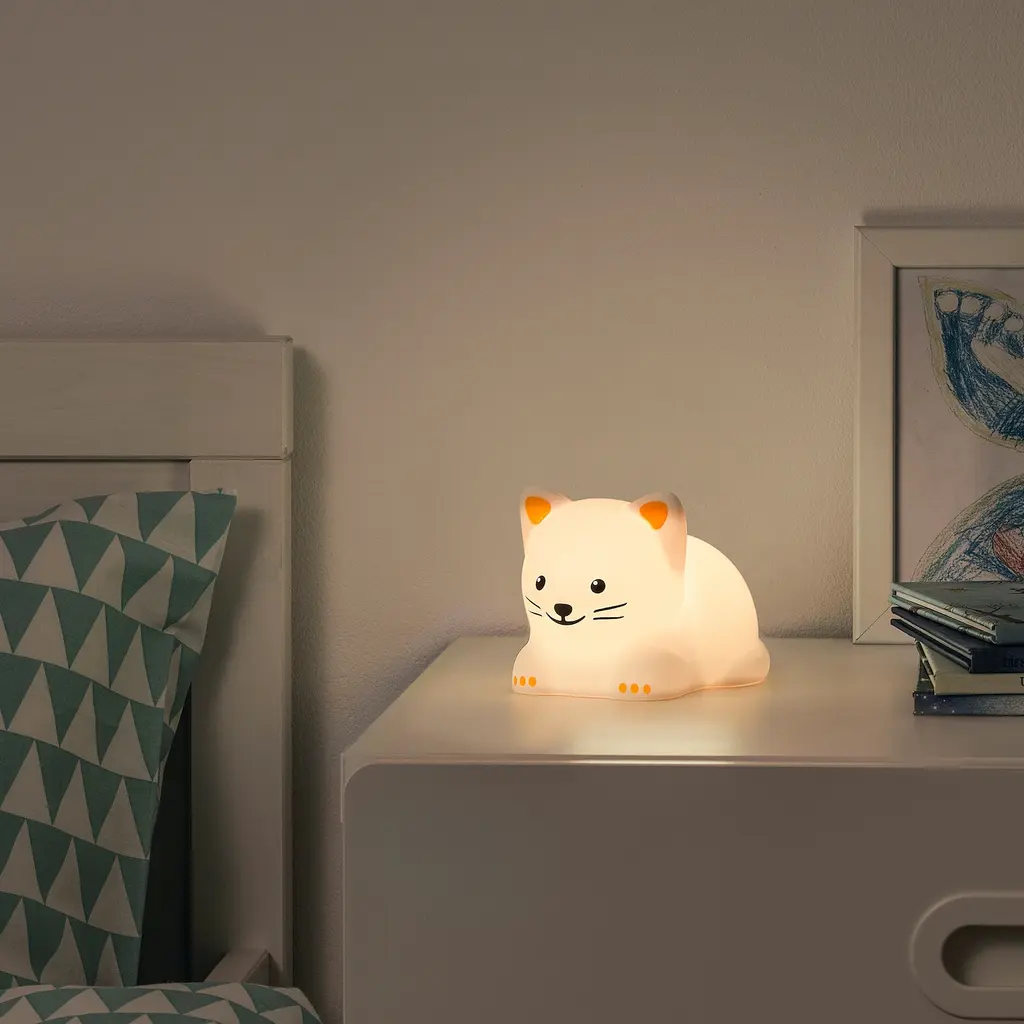 TÖVÄDER LED night light - cat battery operated. With the built-in timer you can choose if the lamp should turn off after 30 minutes or 8 hours. Your child can easily turn the lamp on and off by themselves – and change the color of the light by pressing on the animal's smooth surface.