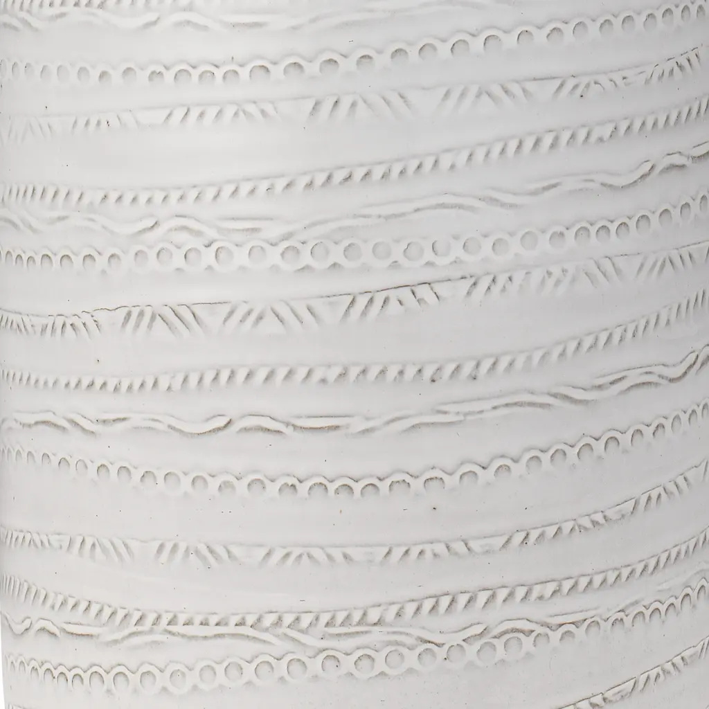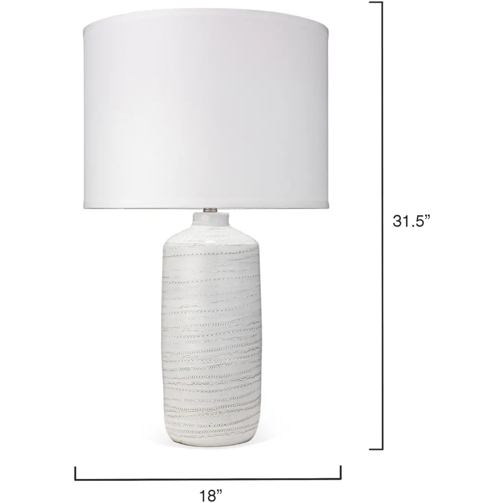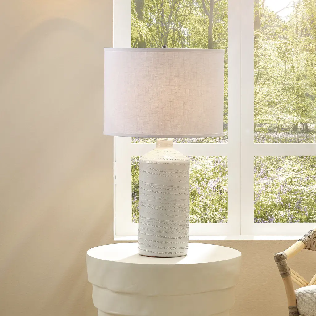 Add a cool coastal vibe to your space with this table lamp. Its rounded ceramic base features subtle line patterns for texture and visual interest, finished in white and topped with a linen drum shade that diffuses the light. This lamp offers a twist on traditional design for a tone-on-tone beauty.