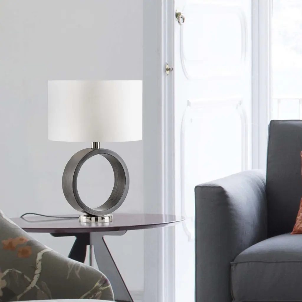 The Tracey Ring Table Lamp Charcoal Gray is a contemporary and unique design by NOVA of California which will add a charming touch to your home decor. This beautiful table lamp is perfect for your modern home with brushed nickel and charcoal gray finish, and body made of a wood and steel blend comes with a white drum-shaped linen shade to give a perfect soothing effect. Its features also include an inline on/off switch for added convenience. A versatile accent piece: the Nova Tracey ring table lamp measures 24"H x 16"L x 16"W and weighs 7 lbs. This lamp adds wonderful visuals to your living space Durable constructions: this modern table lamp is built from wood-MDF construction with steel making it more durable and sturdy. The Linen shade brings long-lasting elegance Elegant Lighting shade: the shade of the lamp is made of Linen. Requires 1x 100W medium base bulb. The bulb is controlled by an on/off switch with Brushed Nickel and charcoal gray finish Contemporary design: this modern Nova of California creation will amplify the elegance of the modern look of your lovely home Buy with confidence: Nova was founded in 1923 with a commitment to creating original home decor designs that were well crafted with attention to detail and this piece is no exception Finish: Charcoal Gray, Brushed Nickel Shade: White Linen