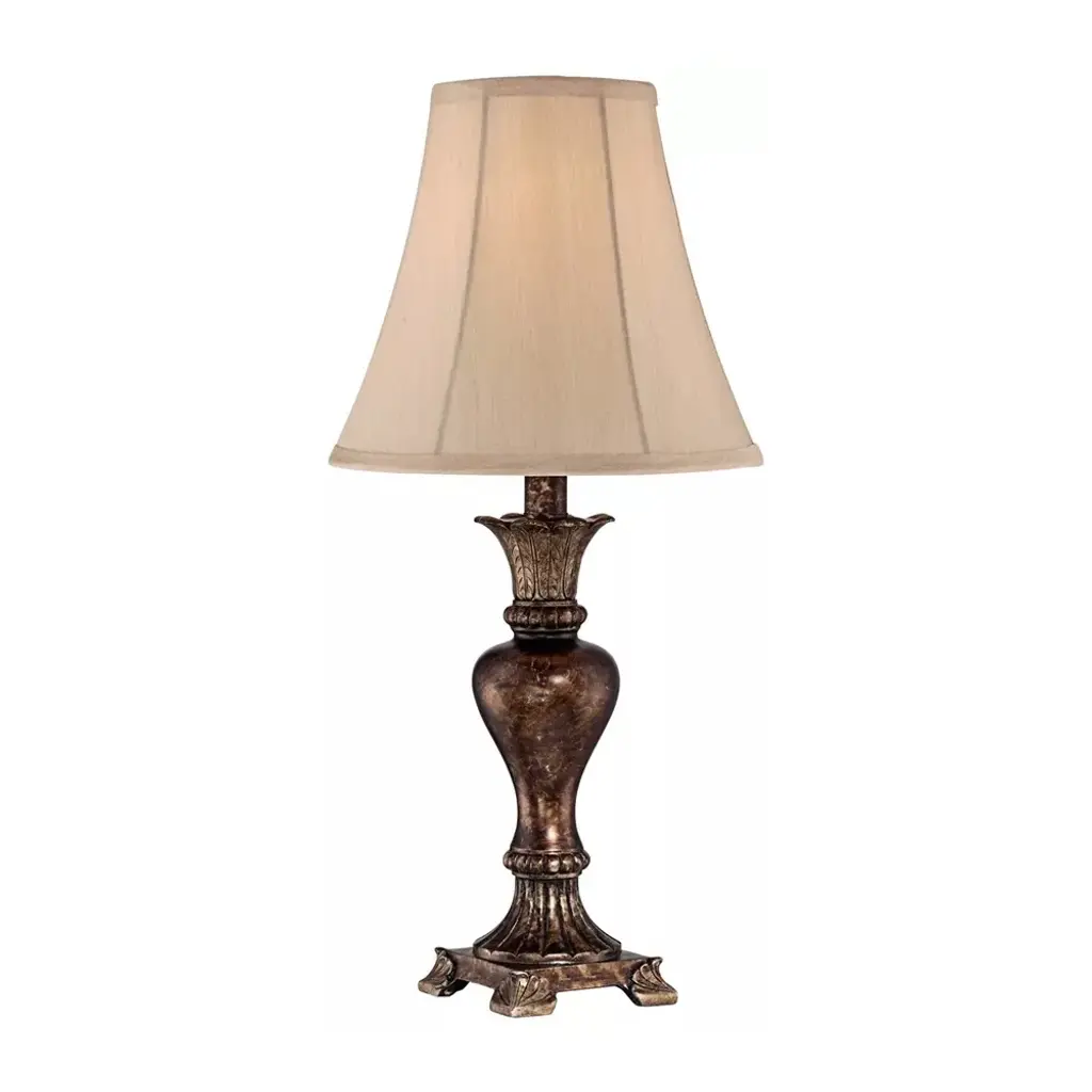 PRODUCT DETAILS: 21" high overall. Shade is 5" across the top x 10" across the bottom x 9" high. Weighs 5.3 lbs. Uses one maximum 60 watt standard-medium base bulb (not included). On-off socket switch. Traditional urn table lamp. A charming look for a living room side table or use in the bedroom. Warm bronze lamp base finish. Decorative footed base. Cast resin construction. Bell lamp shade with top and bottom self trim. 7-foot long cord.
