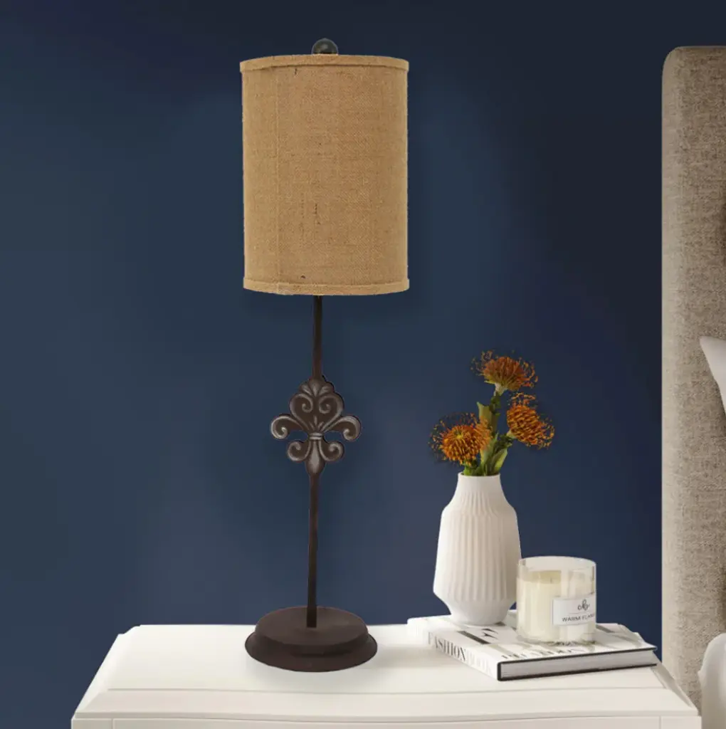 Traditional Fleur-de-lis Bronze Table LampTL-013 Traditional Fleur-de-lis Bronze Table Lamp, The elegant and simple design of Teton home TL-013 Traditional Fleur-de-lis Bronze Table Lamp makes it a wonderful part of a transitional or traditional room. The fleur-de-lis decorated metal base has been finished in dark bronze, and a khaki linen drum shade gently sits on it, creating a cozy vibe for your space.. This piece is a table lamp with fleur-de-lis bronze metal pedestal; khaki shade; 31 x 31 x 8 .Model No : TL-013Brand : Teton HomeTraditional Fleur-de-lis Bronze Table Lamptradtional collectionfleur-de-lis bronze metal baseround khaki linen shadeUPC : 035127517834Product Dimensions(W x D x H): 2 x 8 x 7