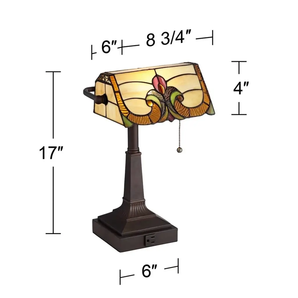 PRODUCT DETAILS: 17" high overall. From front of glass to back of arm is 10 3/4". Weighs 5.72 lbs. Shade is 8 3/4" wide x 6" deep x 4" high. Square base is 6" wide on each side. Uses one maximum 40 watt standard base bulb (not included). Pull chain switch. Built-in power outlet in base. Bronze finish metal body. 6-foot long black cords. Tiffany-style glass shade features over 40 pieces of hand-cut glass assembled in a multi-colored floral-inspired design using the traditional copper soil solder technique. DESCRIPTION: Perfect for a fan of traditional Tiffany-style lighting, this accent desk lamp is a beautiful addition to your table or office space. It comes in a classic bronze finish banker design body, with a colorful art glass shade on top that shines light downwards. Turn the bulb on and off with the dangling pull chain switch. A power outlet is built into the base, adding a surprising but welcome touch of functionality.