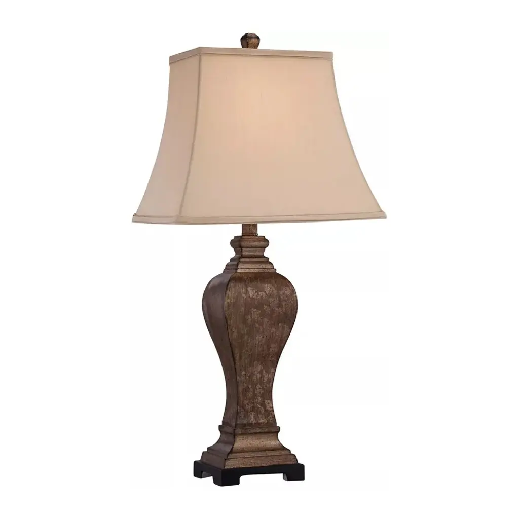 PRODUCT DETAILS: 29" high overall. Rectangle shade with curved sides is 9" wide and 6" deep on top x 14" wide and 10" deep at the bottom x 11" high. Weighs 3 lbs. Uses one maximum 100 watt standard-medium base bulb (not included). On-off socket switch. Traditional table lamp from the Regency Hill brand. Urn-shaped lamp profile. An elegant look for living room lighting. Bronze finish base with black finish footed pedestal. Resin construction. Geneva taupe rectangle shade. 8-foot long cord. Includes a brown finish plug-in tabletop dimmer with a slider switch and USB charing port. Allows the lamp to operate like a dimmable 3-way design. 8-foot long cord. Maximum capacity is 100 watts.