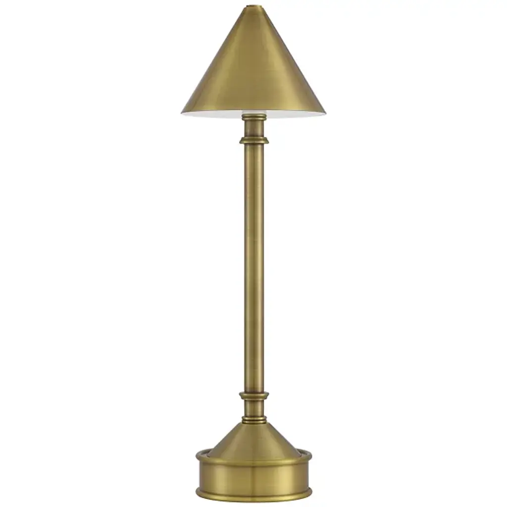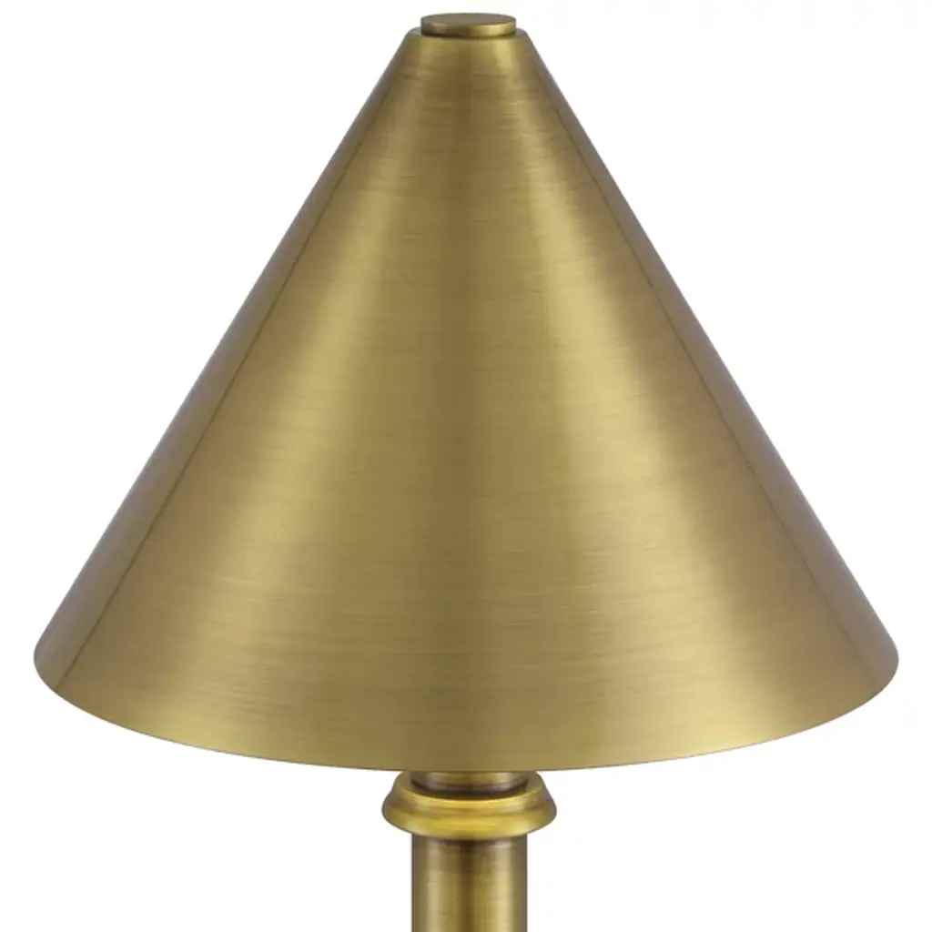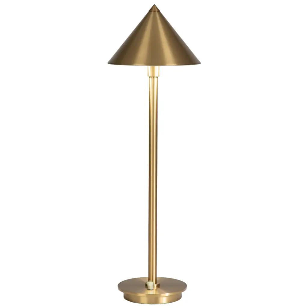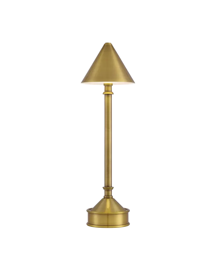 The Traipse Cordless Table Lamp from Currey & Company delivers light wherever you need it. A built-in rechargeable system powers this portable lamp, while a convenient side switch controls operation. Its polished brass flared empire shade includes a bottom diffuser for optimal light distribution. The charging base offers quick power replenishment, with additional bases available to create multiple charging stations. This cordless piece combines function with refined aesthetics, proving that convenient lighting can maintain high design standards.