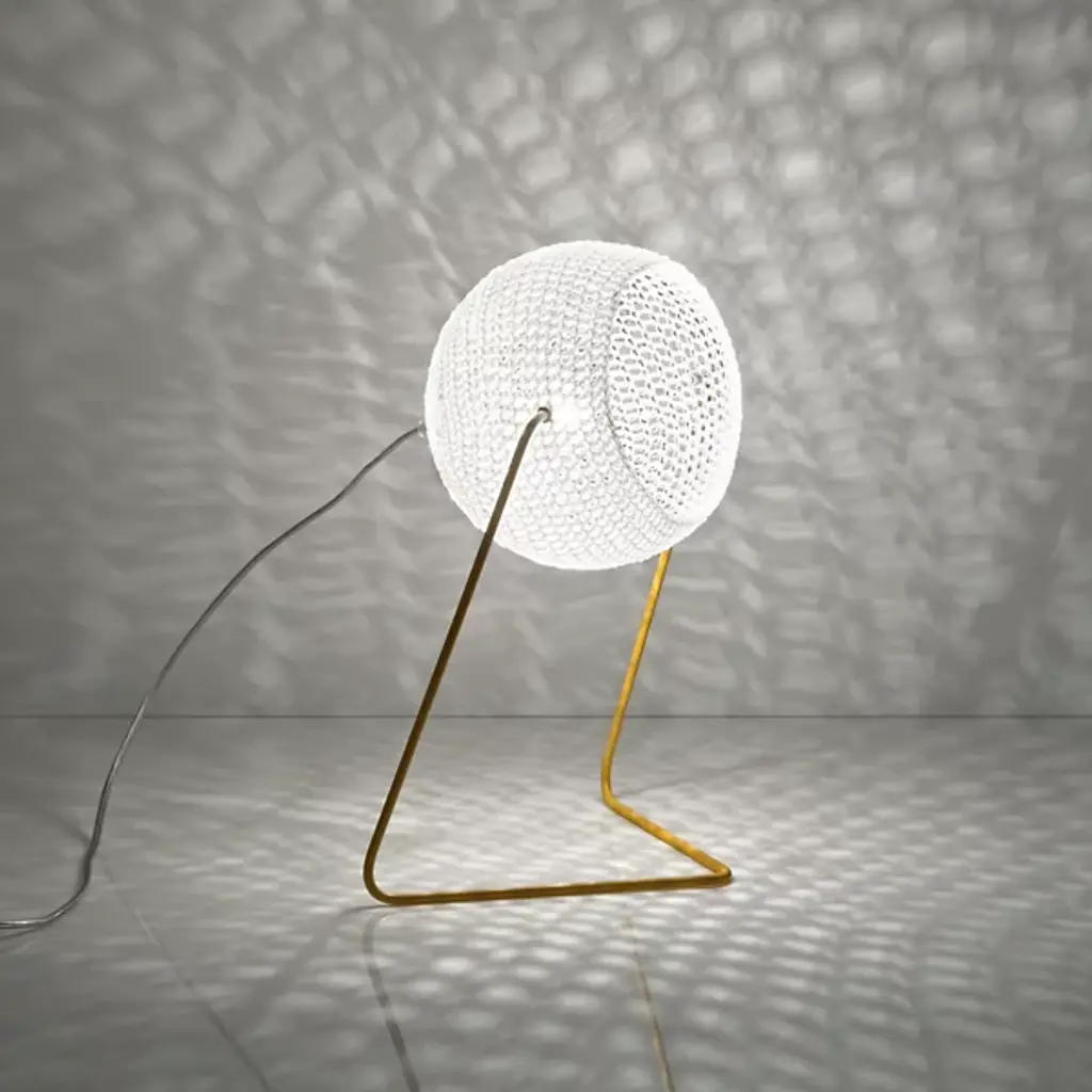 The In-Es Art Design Trama T1 Table Lamp creates a wealth of patterned light with the help of a crocheted fabric shade. The white shade is handmade and mixed with resins to hold its spherical shape, allowing patterned light to shine through each opening in the stitching. The shade is always in white, while the angular metal base is painted with different colors to change up the personality of the lamp.