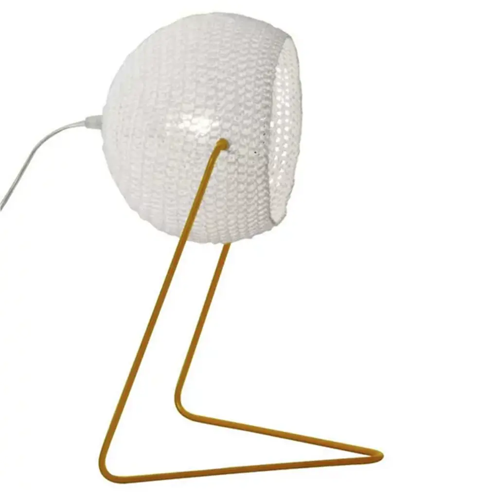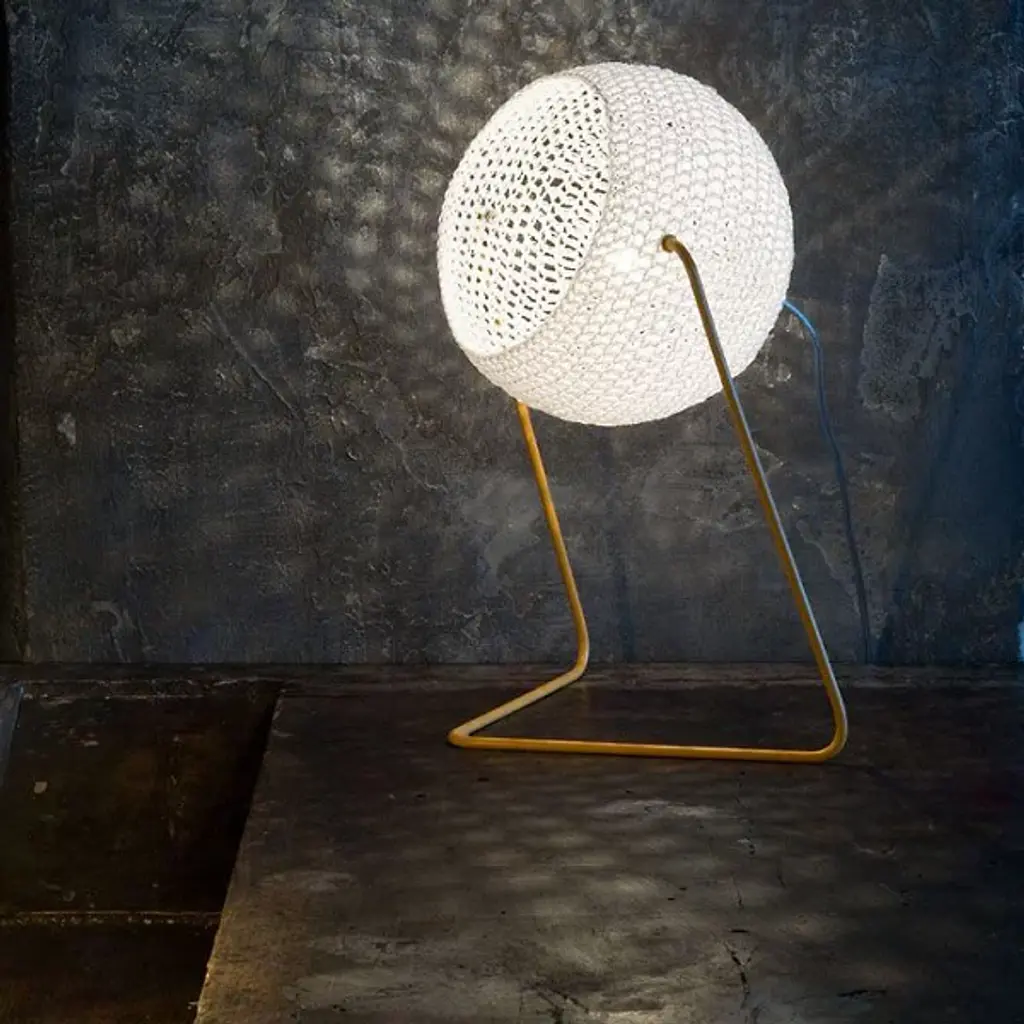 The In-Es Art Design Trama T1 Table Lamp creates a wealth of patterned light with the help of a crocheted fabric shade. The white shade is handmade and mixed with resins to hold its spherical shape, allowing patterned light to shine through each opening in the stitching. The shade is always in white, while the angular metal base is painted with different colors to change up the personality of the lamp.
