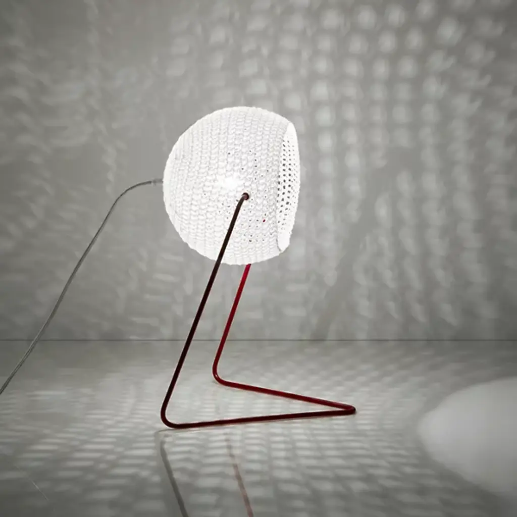 The In-Es Art Design Trama T1 Table Lamp creates a wealth of patterned light with the help of a crocheted fabric shade. The white shade is handmade and mixed with resins to hold its spherical shape, allowing patterned light to shine through each opening in the stitching. The shade is always in white, while the angular metal base is painted with different colors to change up the personality of the lamp.