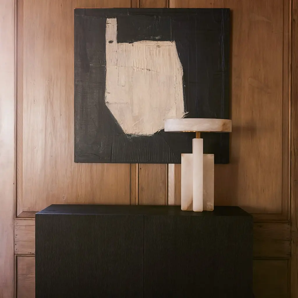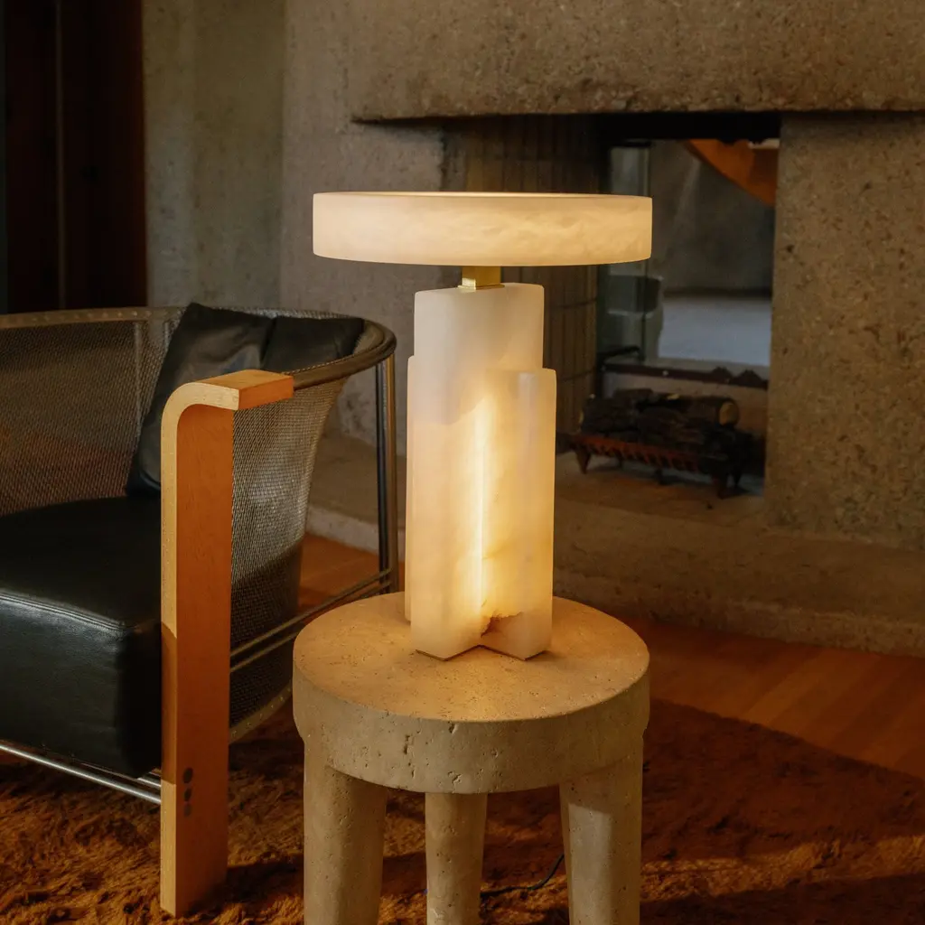 A laud to the beauty of natural stone, the Trancas Medium Table Lamp features a pillar of natural alabaster rises in stacked sections to form a uniform base and shade. Its illumination gives the translucent stone a warm glow, creative a distinctive voice full of modern sophistication and soul.