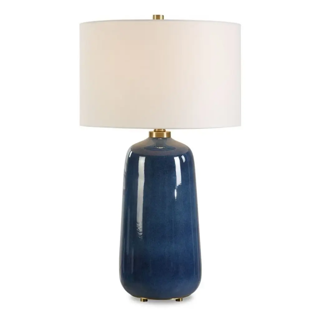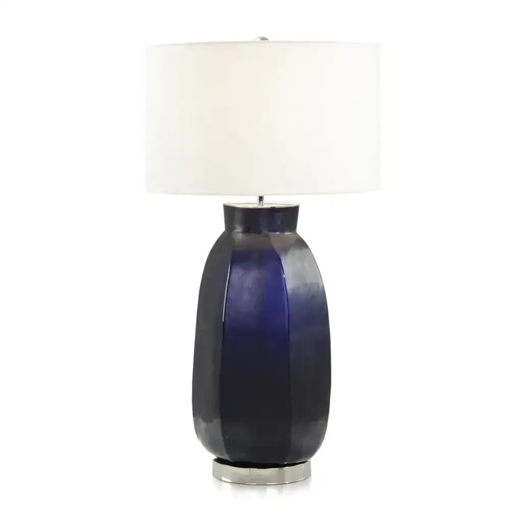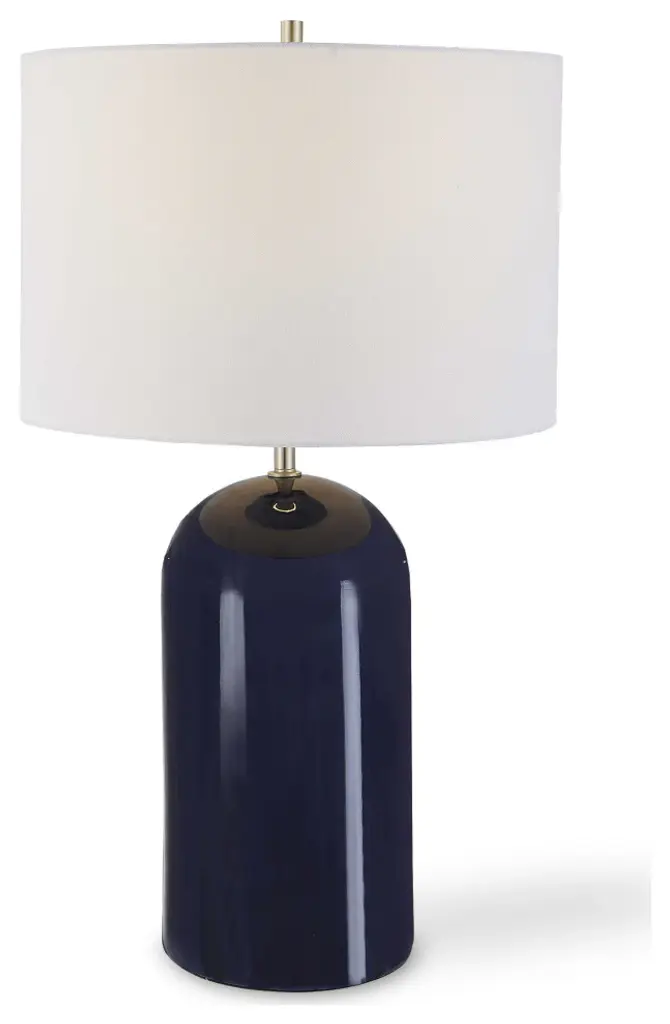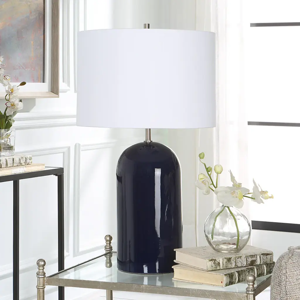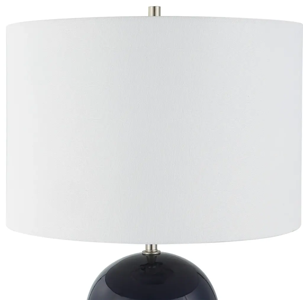 This beautiful dome shaped ceramic table lamp is finished in a navy blue with brushed nickel accents. A white linen round hardback shade completes the look and is perfect for your coastal hideaway.