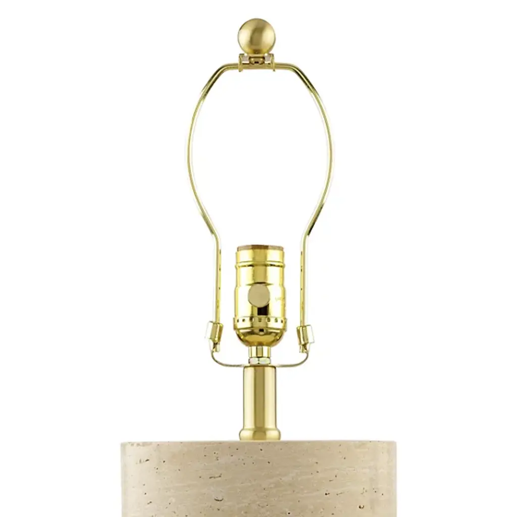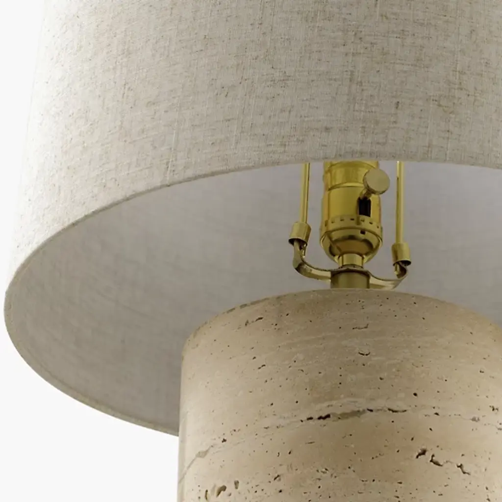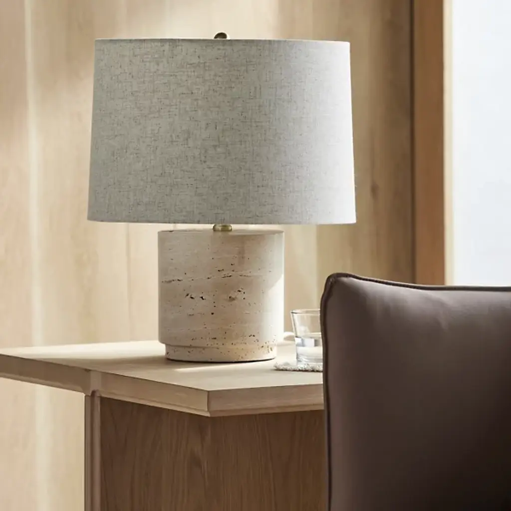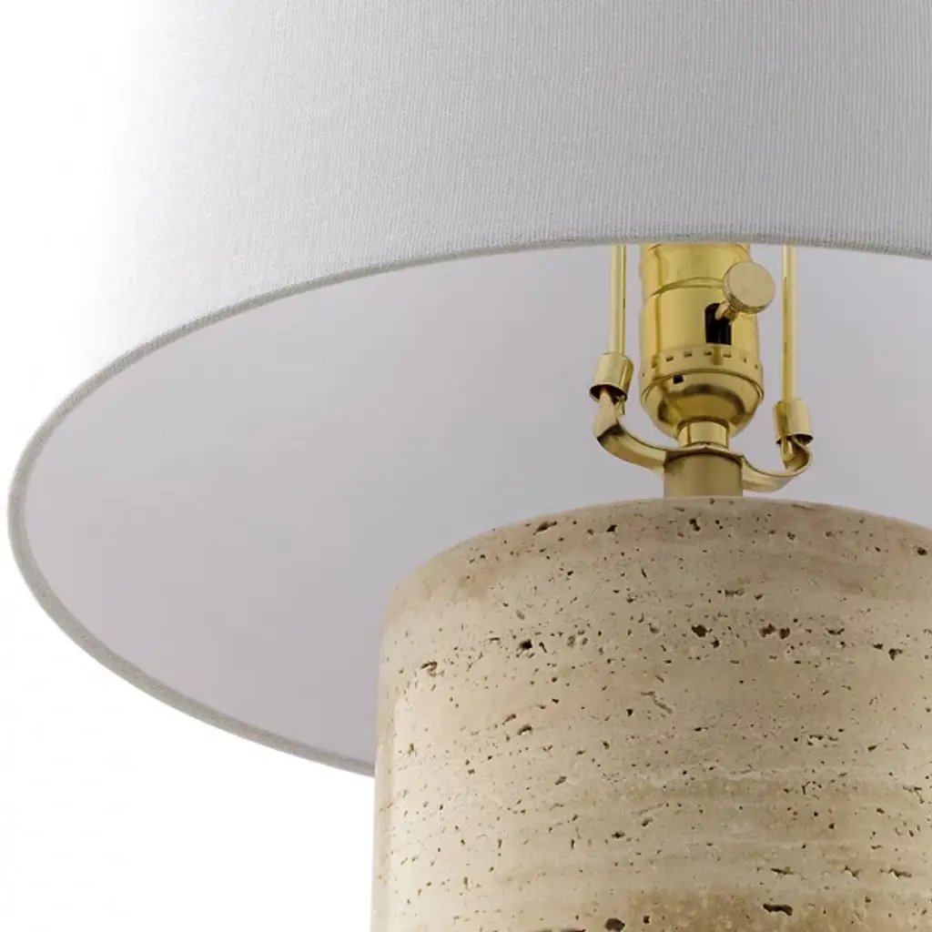 The Travera Accent Table Lamp from Surya blends natural travertine stone with a linen cylinder shade. The stone base has distinctive layers and patterns unique to each lamp, making your piece truly one-of-a-kind. Light flows downward, highlighting the texture of the stone while providing practical illumination for reading or ambient lighting. Its simple cord switch keeps the design clean and uncluttered. This global-inspired lamp fits well in bohemian spaces or rooms featuring other natural materials.
