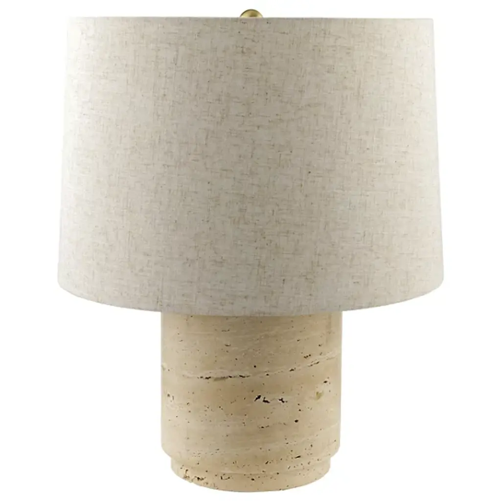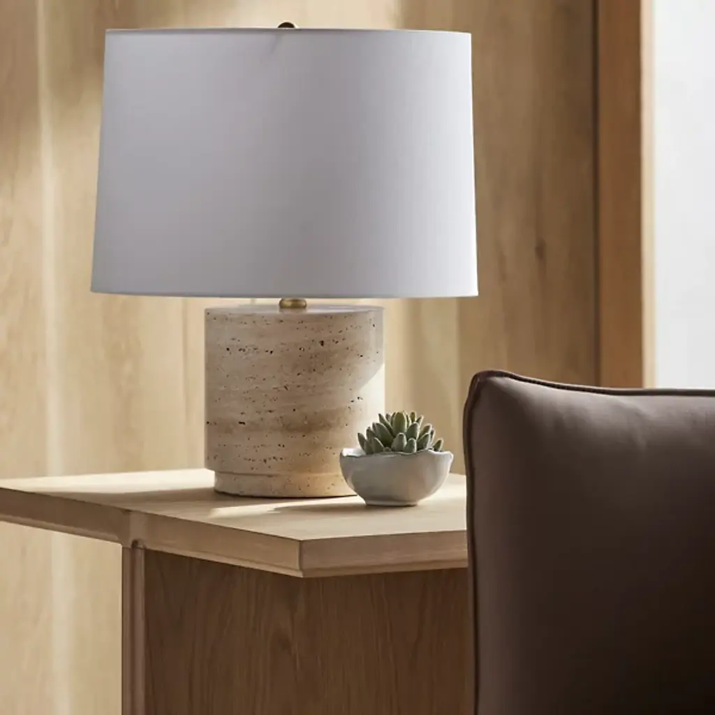 The Travera Accent Table Lamp from Surya blends natural travertine stone with a linen cylinder shade. The stone base has distinctive layers and patterns unique to each lamp, making your piece truly one-of-a-kind. Light flows downward, highlighting the texture of the stone while providing practical illumination for reading or ambient lighting. Its simple cord switch keeps the design clean and uncluttered. This global-inspired lamp fits well in bohemian spaces or rooms featuring other natural materials.