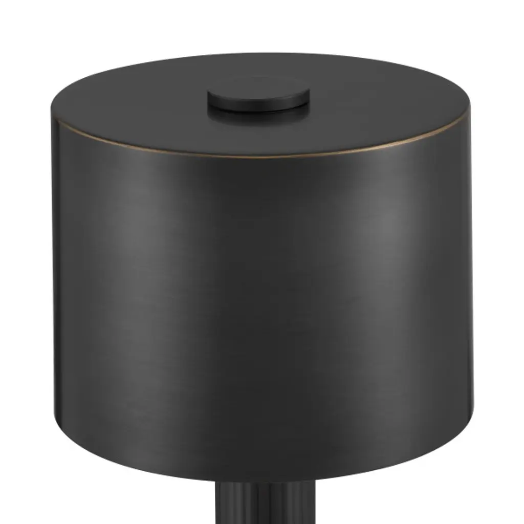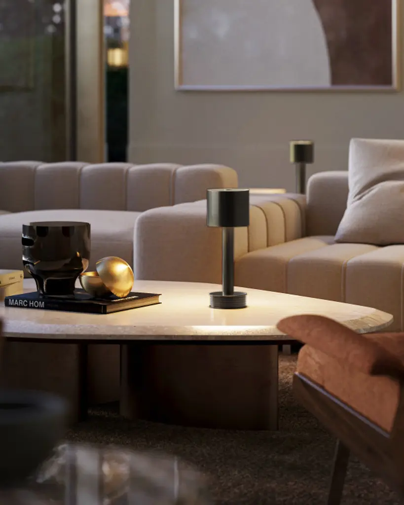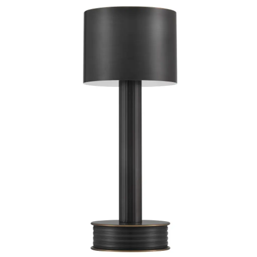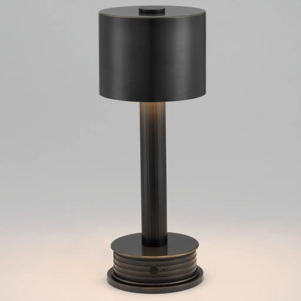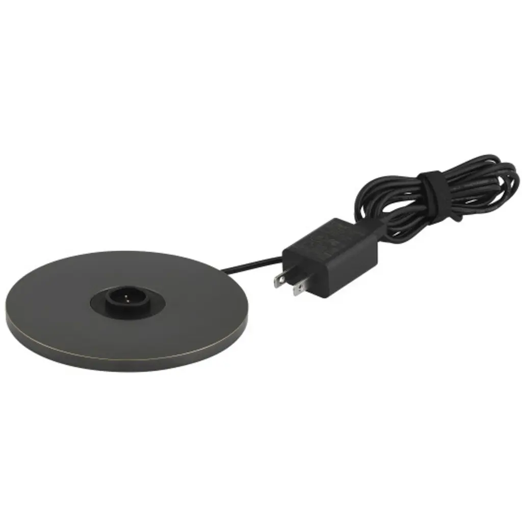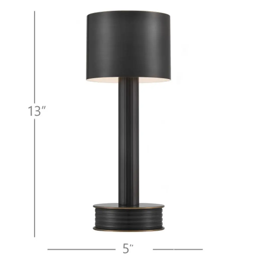 The Traverse Cordless Table Lamp is a versatile lamp that moves around easily. The metal lamp is petite in size, and its base holds the on/off switch. The matching metal shade complements the rest of the lamp. To recharge, simply place the lamp on its separate charging pad.