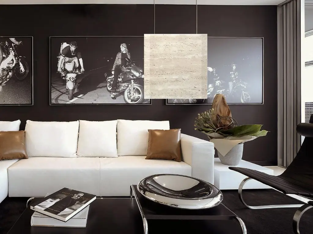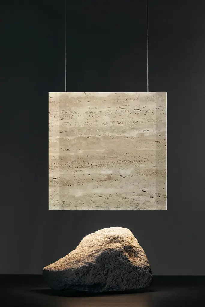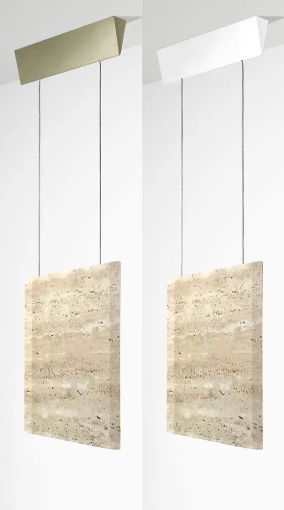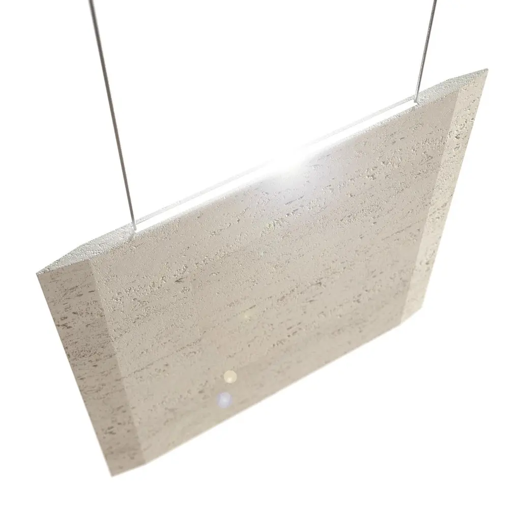 "Travertine Lamp" is a strange title, I know! But I dreamed for a long time a lamp of this kind, I dreamed a piece of stone, suspended like a sculpture, that could secretly illuminate my studio,and my thoughts. Hiding such a powerful light inside wasn't easy: the challenges were represented by the small thickness of the object and the light emission that, according to my vision, had to be released both upwards and downwards. The effort has been worthwhile and the result is poetic: stone has never seemed so light! The Werner Sr. suspension lamp does not invade the environment but furnishes it with class, thanks also to an enveloping and discreet light that guarantees a high visual comfort. Structure composed of a thin square in marble, double emission of LED light, suspension with steel wires.-Stone "Roman Travertine" -Drivers 110/220v - 13 w LED - 2700 k -Price including taxes.