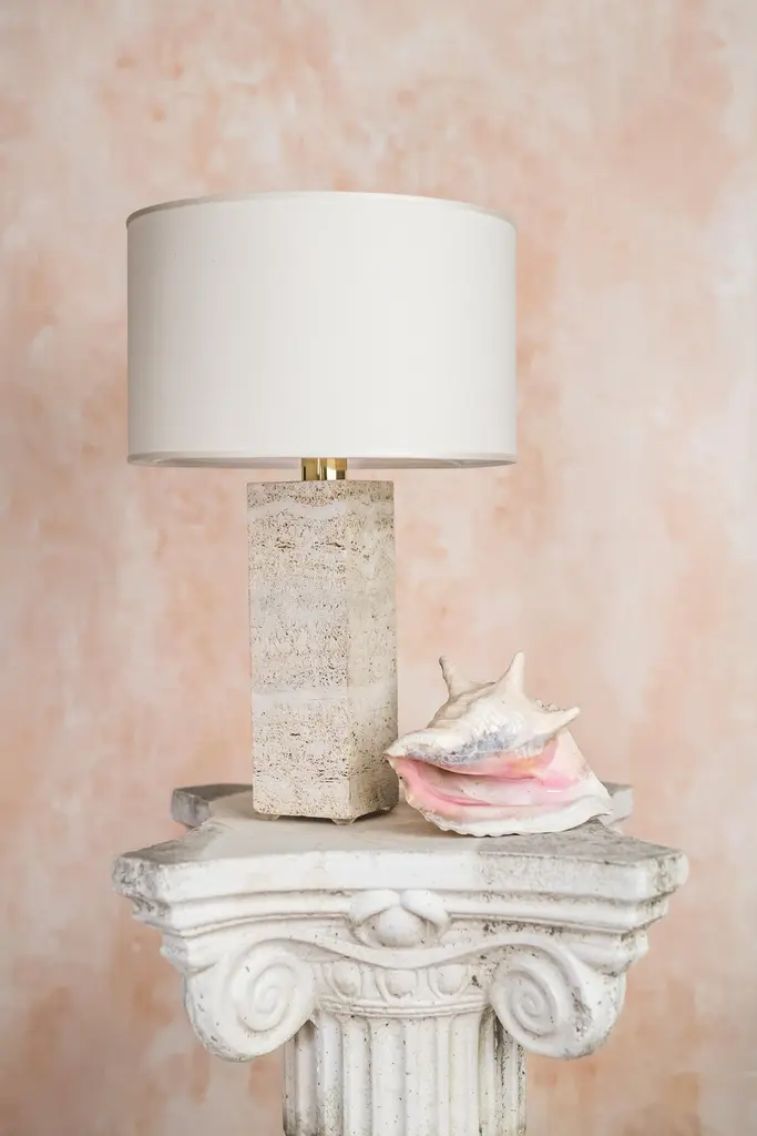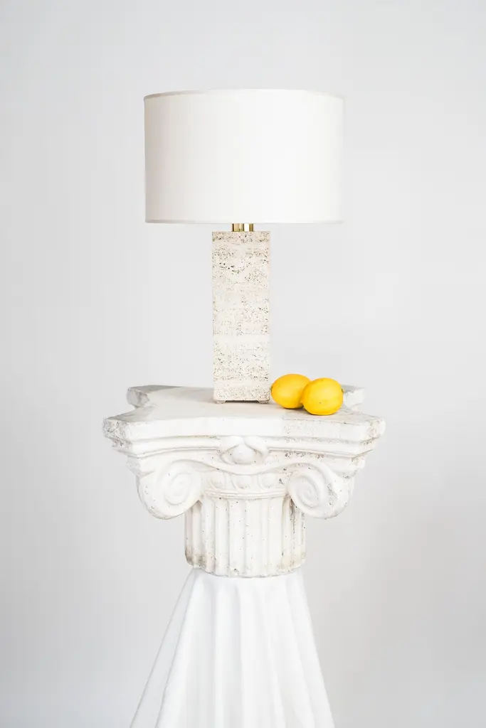 Travertine sculpted table lamp by Brajak VitbergCAPRI 1.1.Materials: Travertine, Polished brassWhite or black cotton lampshade, cotton wiringDimensions: 52 x 35 x 35 cmBijelic and Brajak are two architects from Ljubljana, Slovenia.They are striving to design craft elements and make them timeless through experimental designing process.The studio creates a range of products from handmade and limited small series to one piece unique products, inspired by materials and forms that create incomplete perfection.All our lamps can be wired according to each country. If sold to the USA it will be wired for the USA for instance.