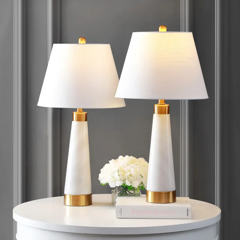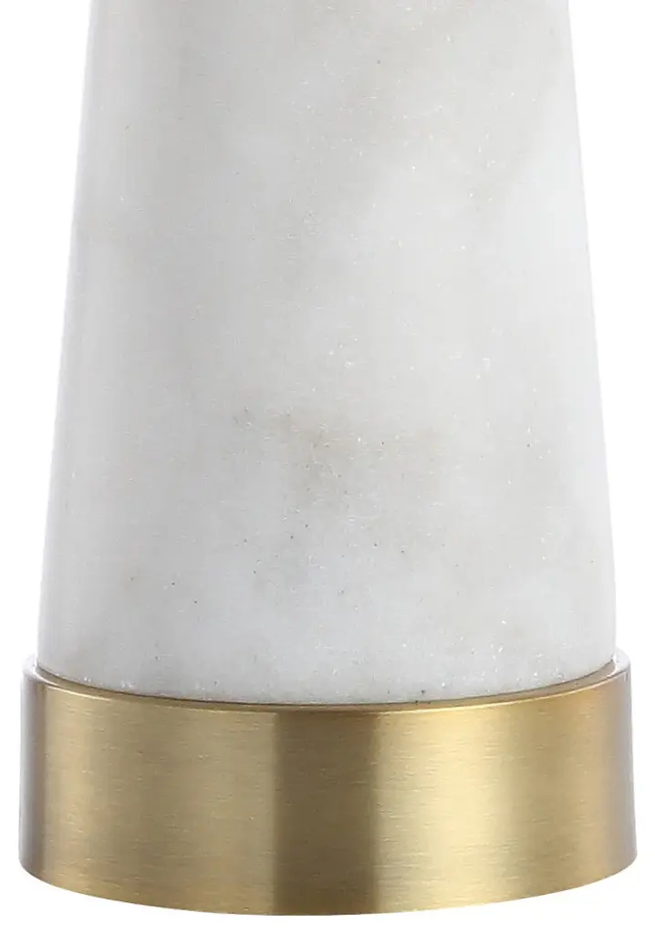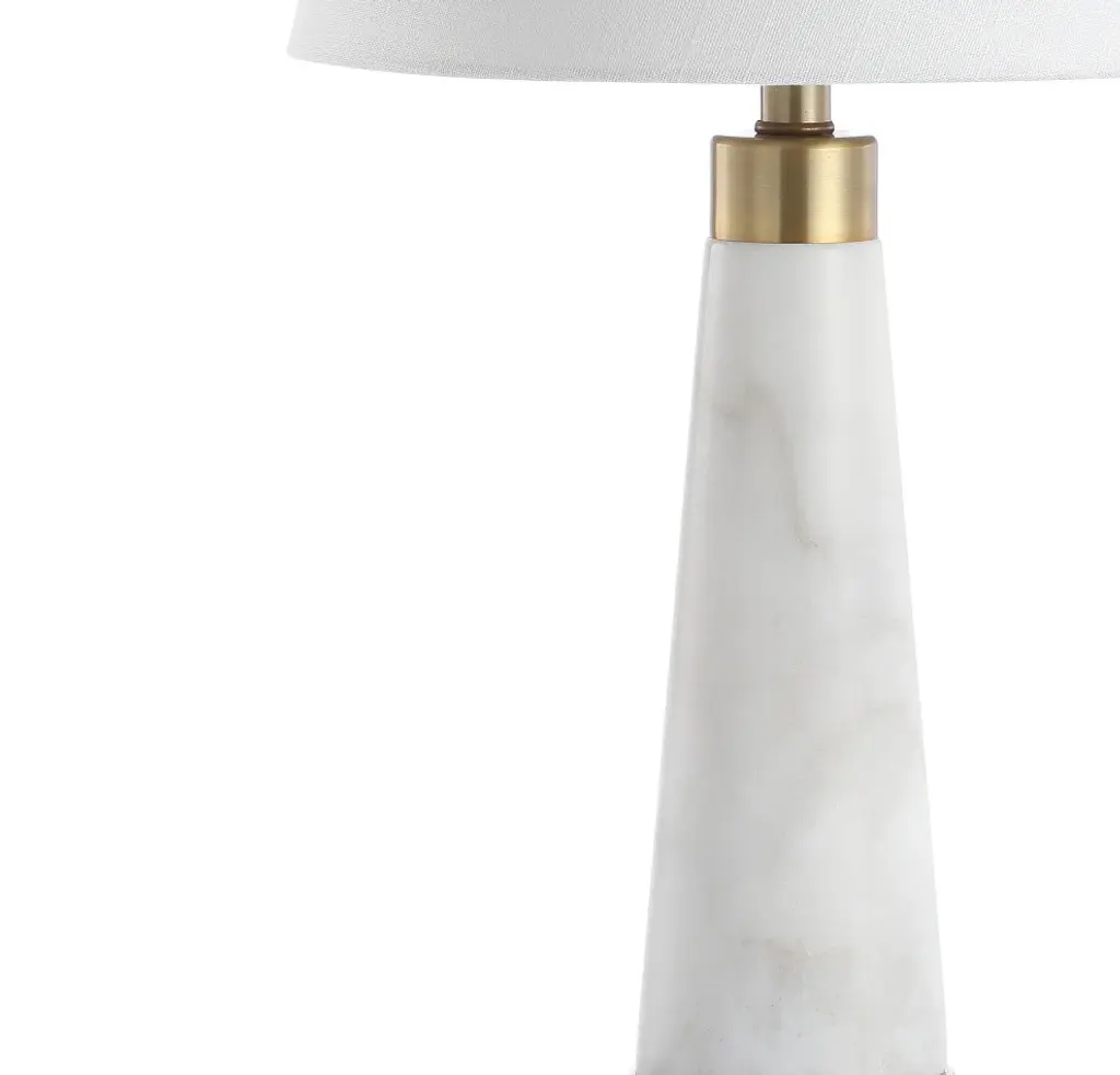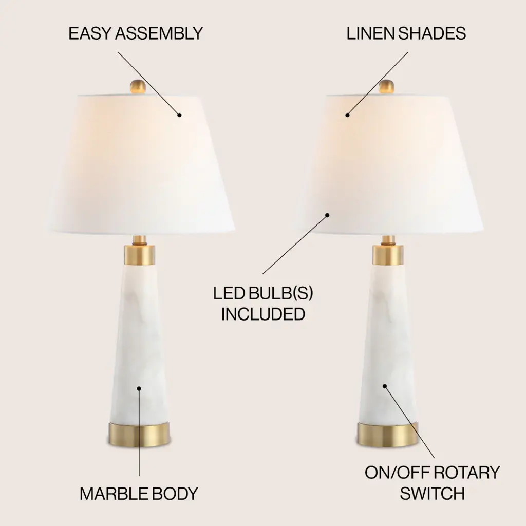 This modern column lamp adds a low-key touch of glamor to contemporary or traditional rooms. The solid marble base is accented with brass-gold banding and gold finial. The LED bulb is bright enough for reading, and shaded by a classic tapered lampshade. Features:• This minimalist-inspired lamp is a versatile 26.5" tall, perfect for a living rooms and bedrooms• Quality touches include a silk-wrapped cord and tapered fabric lampshade• Eco-friendly 9W bulb included• Takes 1 bulb and compatible with any 12W LED or 100W TYPE "A" or 23W CFL• UL Listed• Color: White/Brass Gold Base with white shade• Body Material: Marble/Iron• Includes: Two (2) lamps• Assembly RequiredDimensions:• Lamp: 26.5 inches high x 14 inches wide x 14 inches deepAbout us:You see a lamp.We see a decorative work of art.A perfectly curved shade casts a dramatic shadow on a floor. A silk cord you never want to hide. Compatible with LED lightbulbs: as easy on the environment as they are on the eyes. The JONATHAN Y Lighting collection considers every detail from impeccably sourced materials to designer styling. And our prices are so attractive, weve transformed a functional necessity into a fashion accessory.JONATHAN Y Lighting - a fashion revolution in home decor.