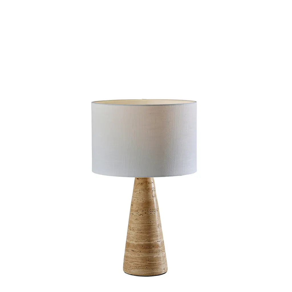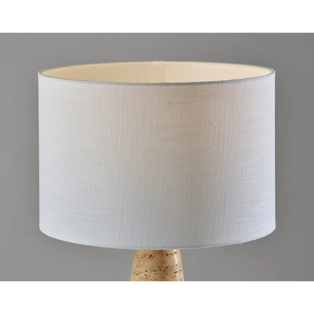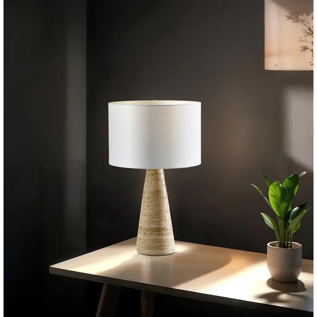 Introducing the 3963-12 Travis Table Lamp, a harmonious blend of natural beauty and contemporary design. This table lamp features a tapered cylinder base crafted from luxurious travertine stone, which brings an element of timeless elegance to your decor. It is topped with a pristine white textured fabric shade that provides a soft and inviting glow. Standing at a height of 21 inches, the Travis Table Lamp becomes a chic addition to any room. Its versatile 3-way rotary socket switch allows you to customize the lighting to suit your mood and needs, making it an ideal choice for your home. Enhance your living space with the 3963-12 Travis Table Lamp, where natural materials meet modern sensibility. Natural Beauty: The 3963-12 Travis Table Lamp features a tapered cylinder base crafted from luxurious travertine stone, adding a touch of natural beauty and sophistication to your decor. Pristine White Shade: Topped with a white textured fabric shade, this lamp diffuses soft, inviting light throughout your space, creating a cozy and warm ambiance. Customizable Lighting: Equipped with a versatile 3-way rotary socket switch, this lamp allows you to adjust the lighting to your preference, from ambient glow to functional brightness. Chic and Compact: Standing at a height of 21 inches, the Travis Table Lamp is a chic and compact lighting solution that complements various design styles and fits perfectly on tabletops, shelves, or nightstands. Timeless Elegance: The lamp's blend of natural materials and contemporary design elements results in a timeless piece that adds a touch of sophistication to any room in your home.