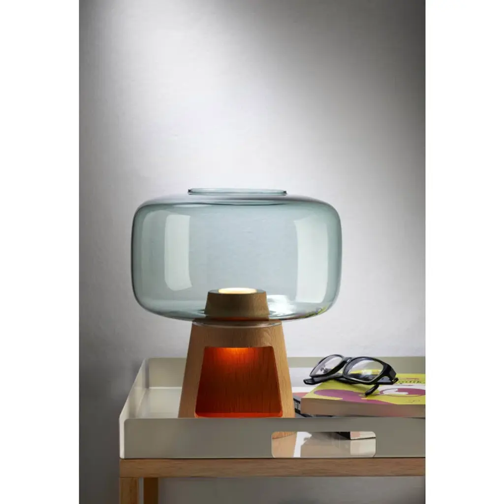 This table lamp has an original oak base. The soft curves of the shade are both homely and inviting, the light creating a soft glow around the room. The sympathetic combination of glass and wood suggests both nature and nurture.