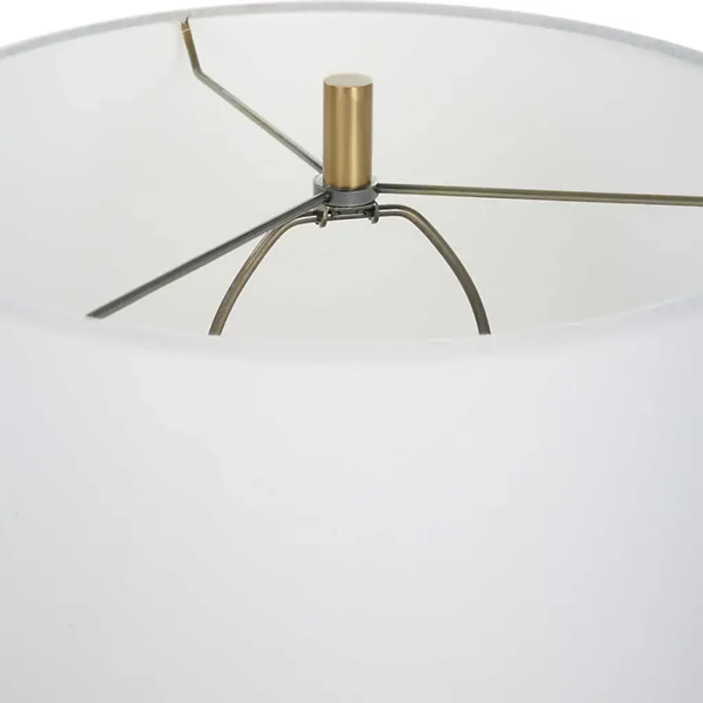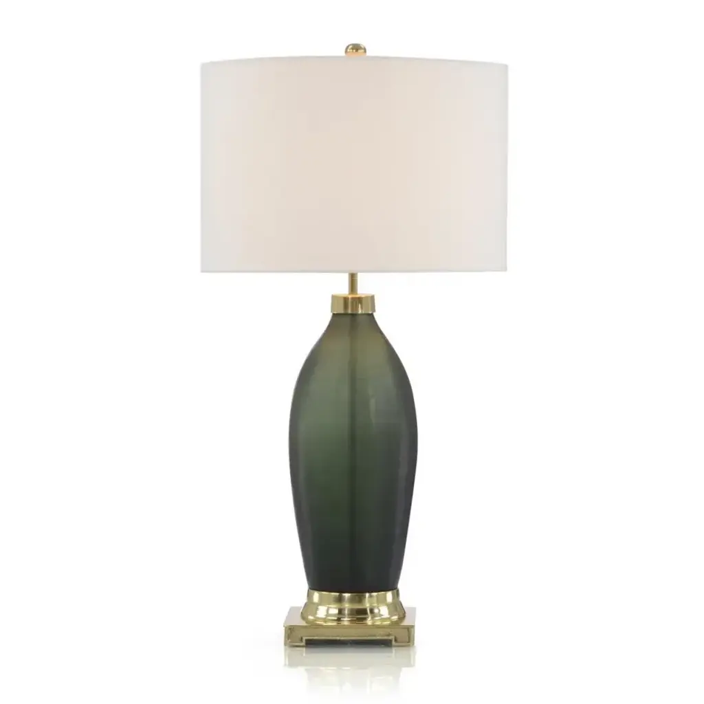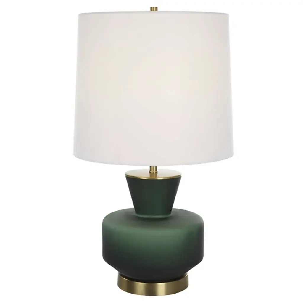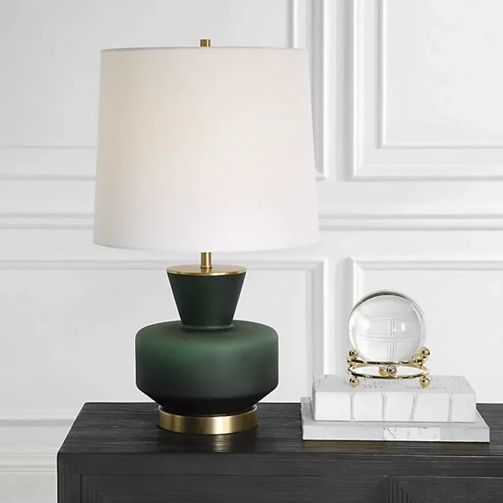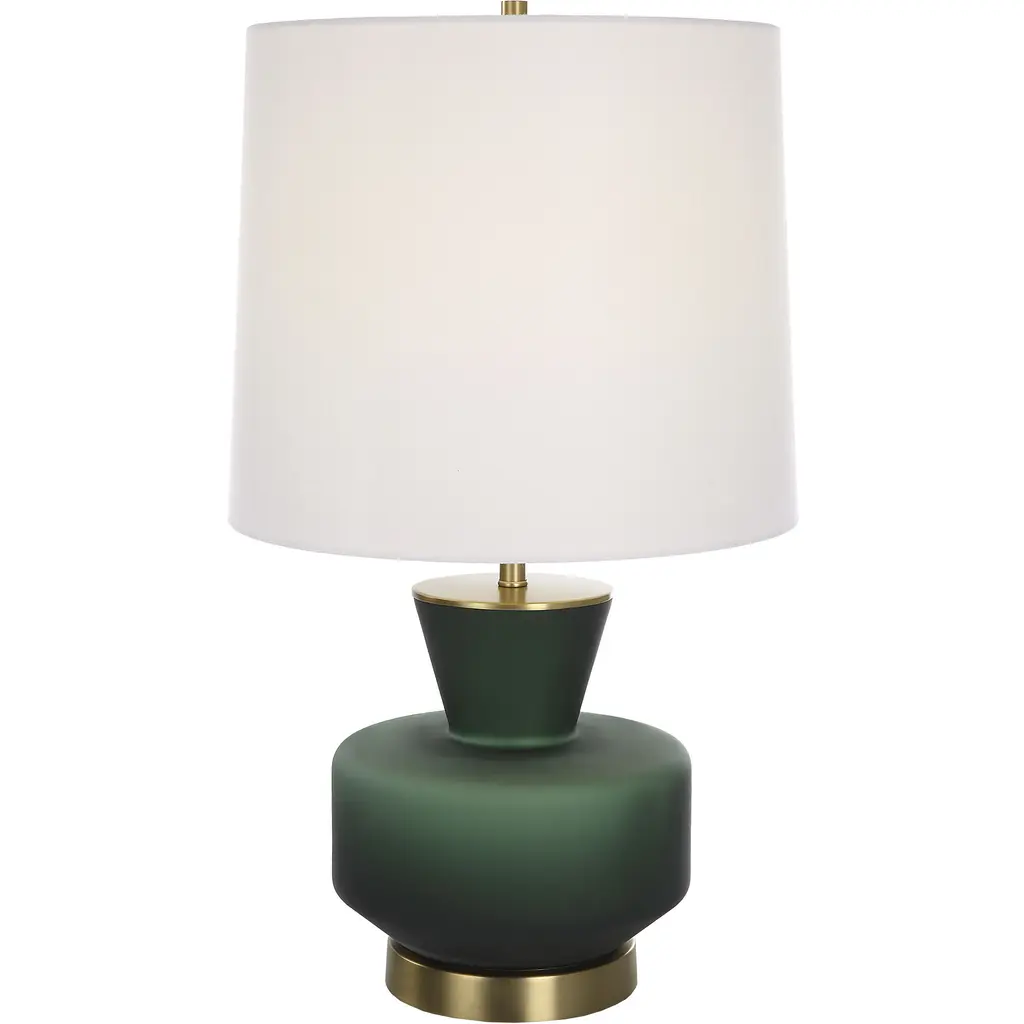 Drawing inspiration from mid-century modern design, the Trentino Table Lamp from Uttermost stands out with its distinctive dark emerald green glass base, beautifully complemented by lightly antiqued brass-plated accents. The lamp is topped with a tapered round hardback shade, meticulously covered in crisp white linen fabric, creating a sophisticated and stylish look. This combination of elegant materials and timeless design elements ensures that this lamp will add a touch of classic charm and contemporary flair to any room.