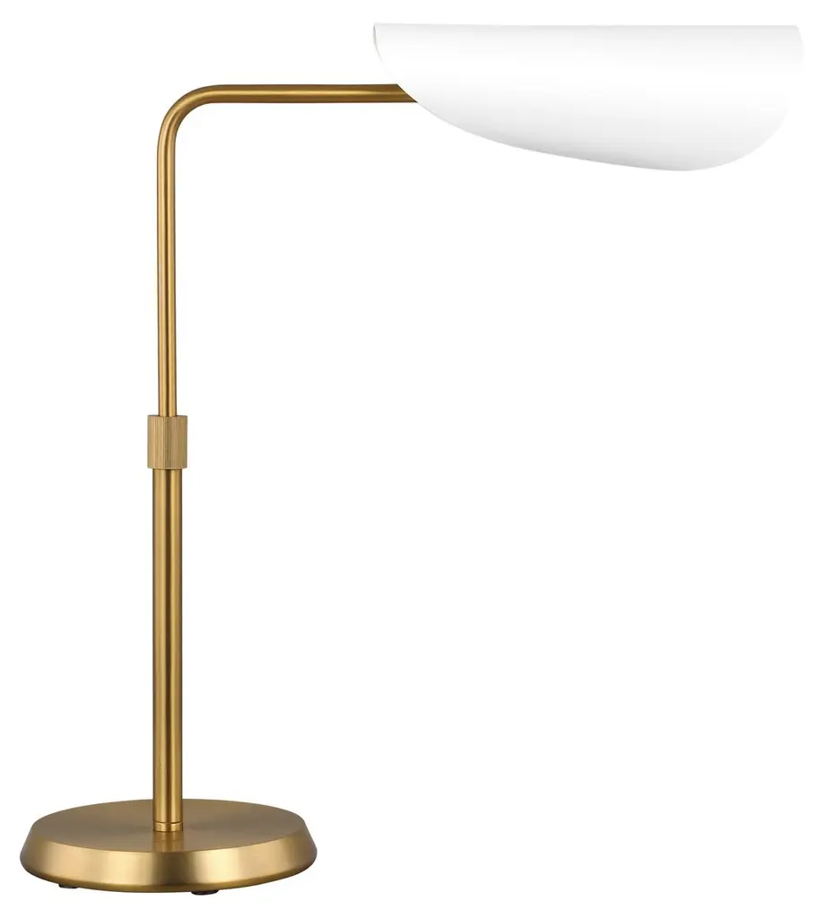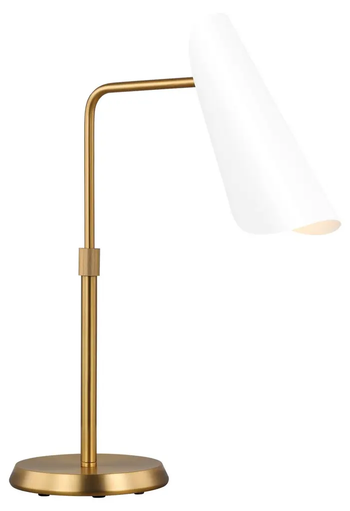 A chic marriage of form and function, this table lamp adjusts in height from just under 20 inches to nearly 30 inches, making it ideal for a bedside, a home office, or a reading nook. The contrast between the black or white angled shade and the burnished brass body adds contemporary glamour.