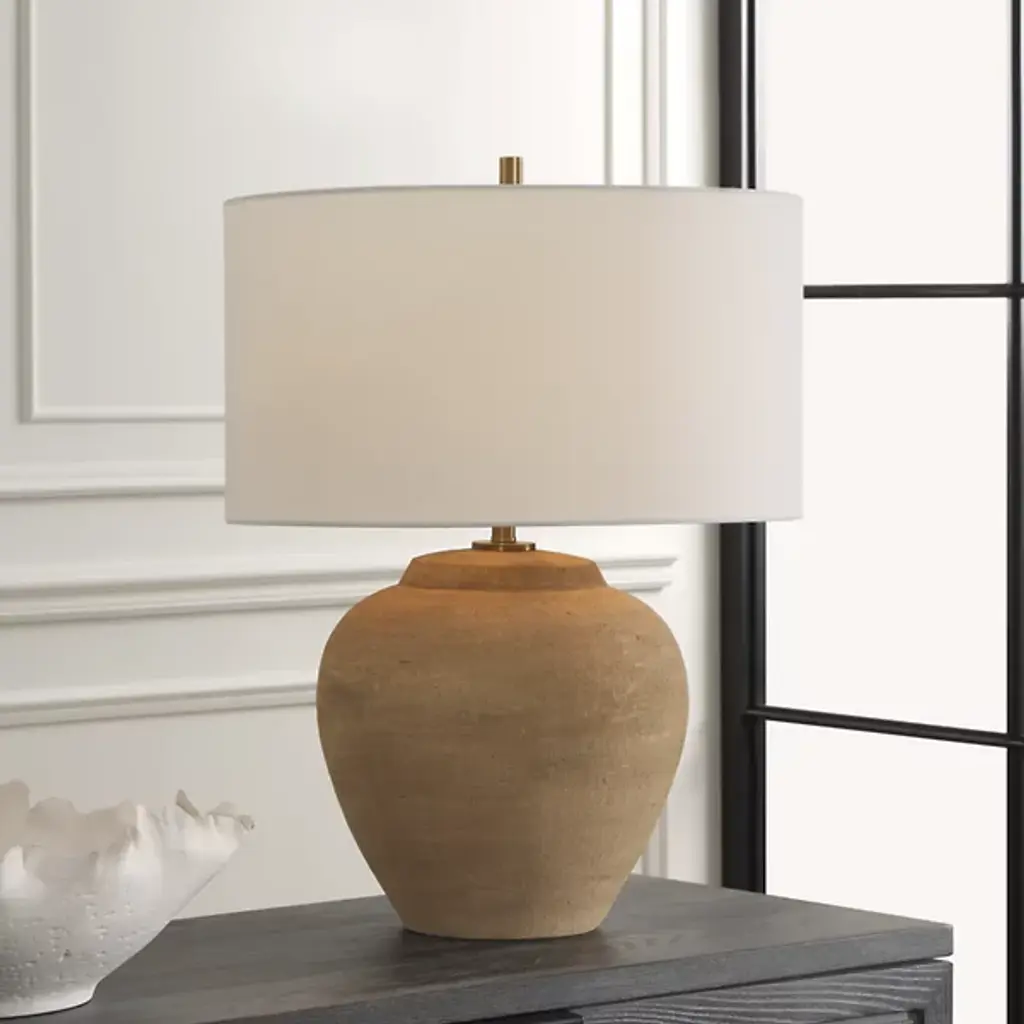 The Treviso Table Lamp from Uttermost seamlessly blends Mid-Century Modern and Transitional styles, adding a cozy, rustic feel to any space. Designed by Jim Parsons, the distressed terracotta base offers a rich, earthy texture, complemented by elegant brushed antique brass accents. Finished with a natural linen shade featuring a tight weave, this lamp radiates an approachable, even glow. It’s an ideal choice for those looking to infuse their home with warmth and rustic style.