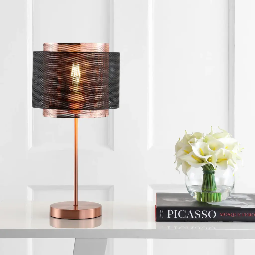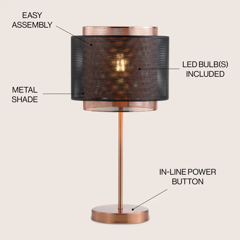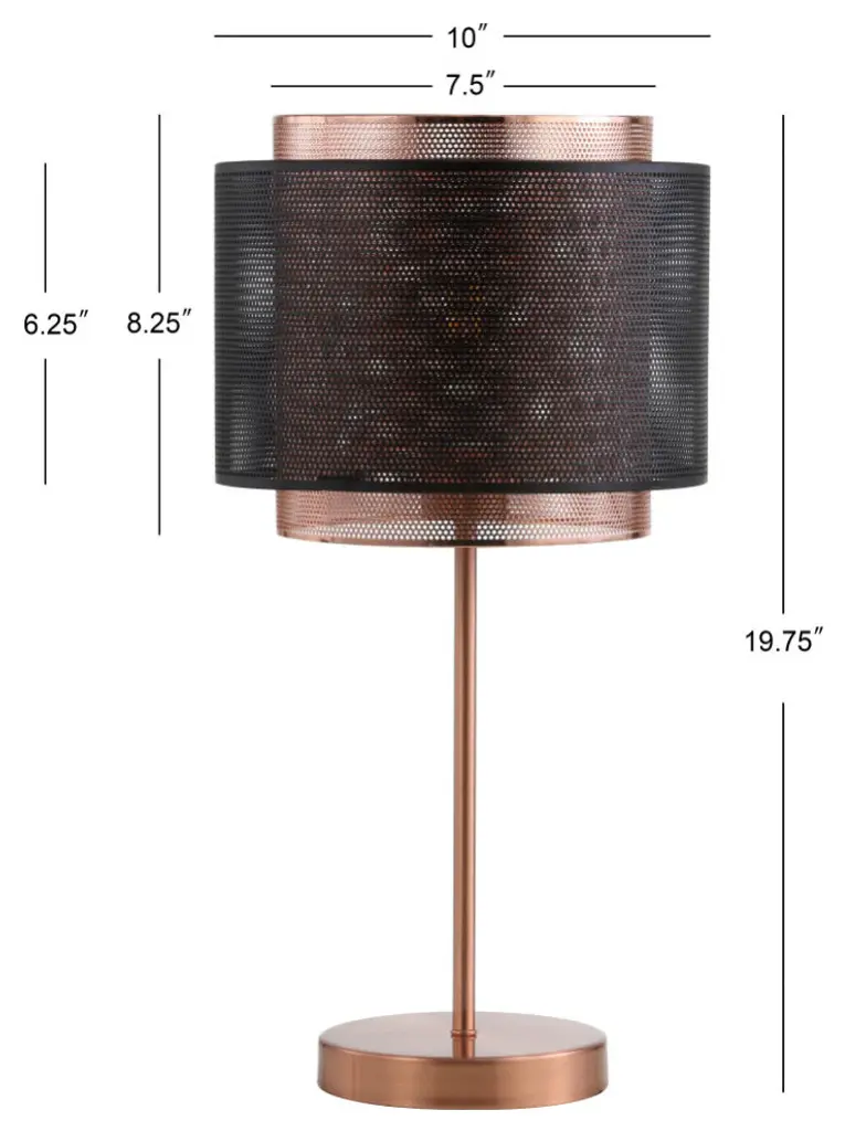 This modern metal table lamp combines two finishes, copper and blackened metal, to stunning effect. Layered mesh drums allow enough light through to give a subtle glow, illuminating but not overpowering your space. The ideal design element for a home office or modern living space it works well with other mixed metal elements. We love the simplicity of the center column base, weighted by the statement-making double shade -- a visual effect opposite to that of traditional table lamps that feature intricate bases and basic shades.Features:Copper and black metal layer together to create a modern look that is statement-making in any space No design element was overlooked -- even the cord is silk-wrapped so it doesn''t have to be concealed The metal shades allow light to shine above and below the lamp, but only a slight glow through the sides of the shade On-off inline switchEco-friendly 4W LED bulb includedTakes one bulb and compatible with any 9W LED or 40W Type "A" or 13W CFLUL Listed Color: Copper/BlackBody Material: MetalBase Material: IronFinial Material: Finial Color: Harp Color: Includes: One (1) lamp(s)Minor Assembly RequiredDimensions:Lamp: 19.75 inches high x 10 inches wide x 10 inches deepShade: 6.25 inches high x 10 inches wide x 10 inches deepAbout us:You see a lamp.We see a decorative work of art.A perfectly curved shade casts a dramatic shadow on a floor. A silk cord you never want to hide. LED lightbulbs: as easy on the environment as they are on the eyes. The JONATHAN Y Lighting collection considers every detail from impeccably sourced materials to designer styling. And our prices are so attractive, we''ve transformed a functional necessity into a fashion accessory.JONATHAN Y Lighting - a fashion revolution in home decor.