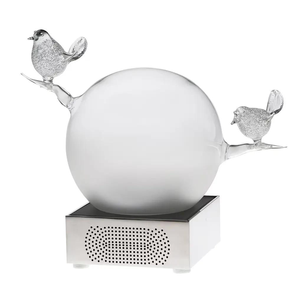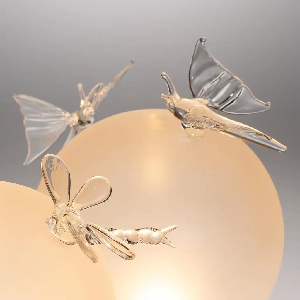 The Trilli Farfalla is a handcrafted, cordless LED table lamp featuring a small glass sphere with two transparent glass butterflies on a sandblasted surface. Inspired by nature, this rechargeable lamp offers three light modes: steady, candle effect, and off, with a 5-hour battery life. Designed and made in Venice by Casarialto, it blends art and technology to create a magical ambiance. Base included.