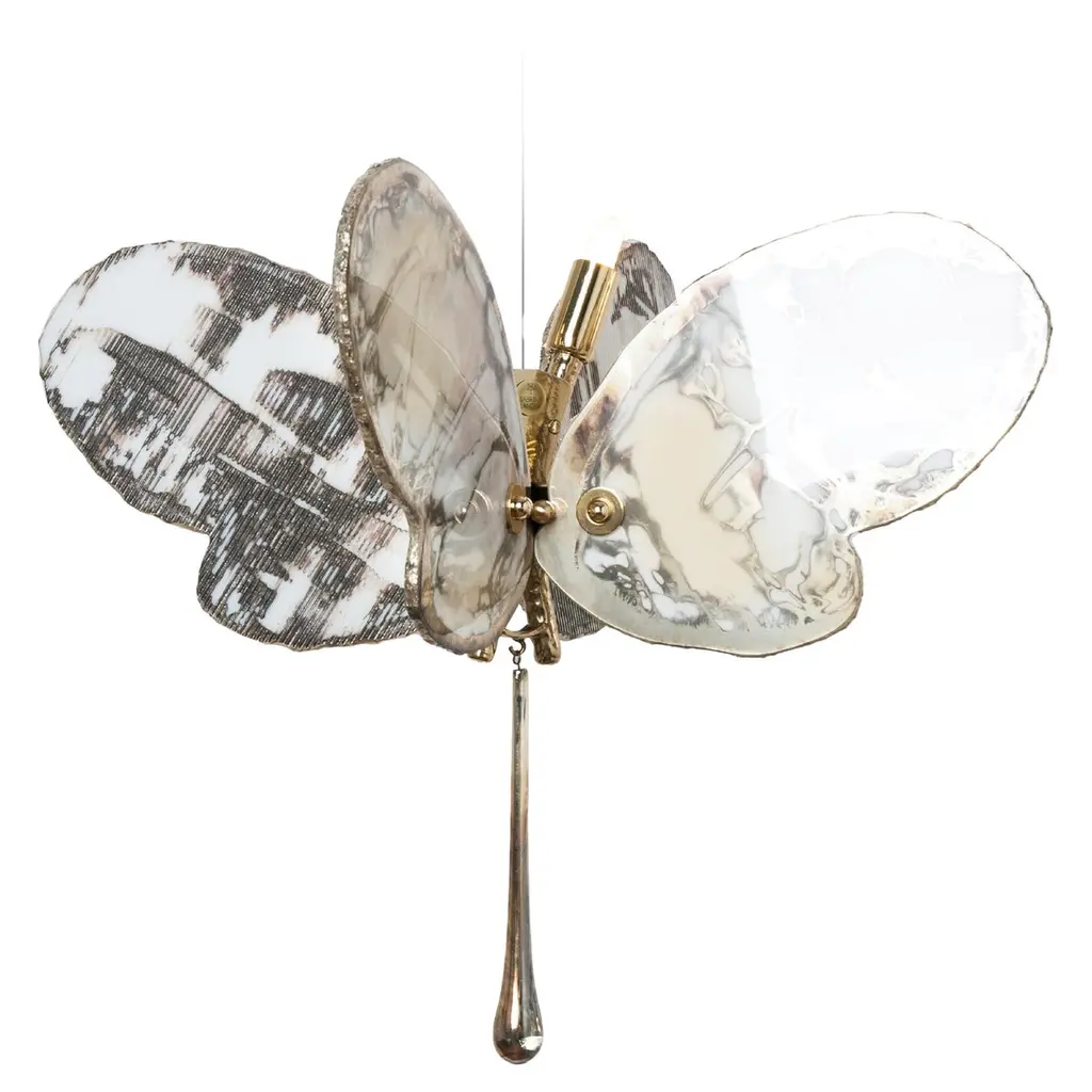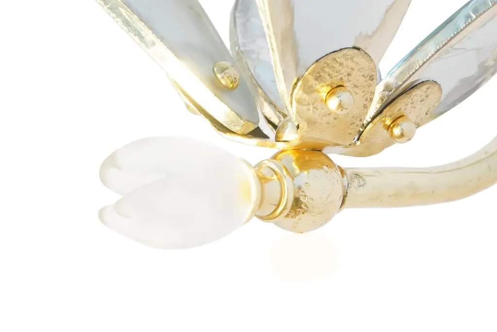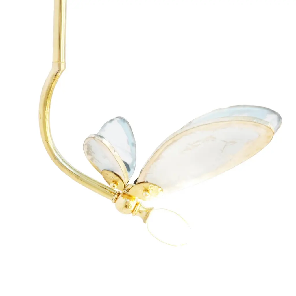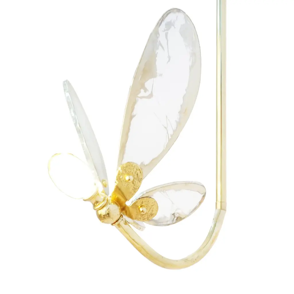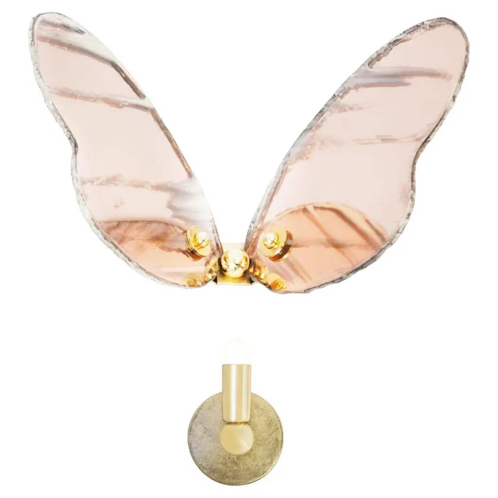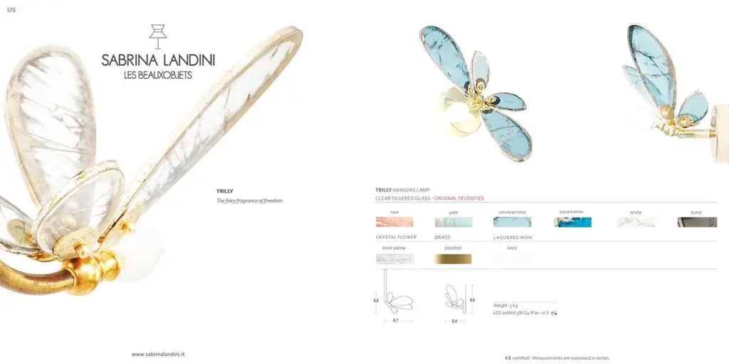 TRILLY The fairy fragrance of freedomSmall and sophisticated, the Trillies, enterely crafted in Italy, are the little sisters of our Butterfly models, they bring an ethereal allure to your home décor, thanks to their colored and silvered glass wings.A forged brass body, silvered glass wings, the special silver plating treatment, masterfully performed over the years by Sabrina, confers uniqueness to the entire object, as the hallmark of the entire collection.Available in a wide range of silvered glass colors :crystal silvering, jade, rose, sun, black, smoky grey, aquamarine, blue CE certified and Electrified : US, EU, UK , 1x G4 lamp holder, dimmable