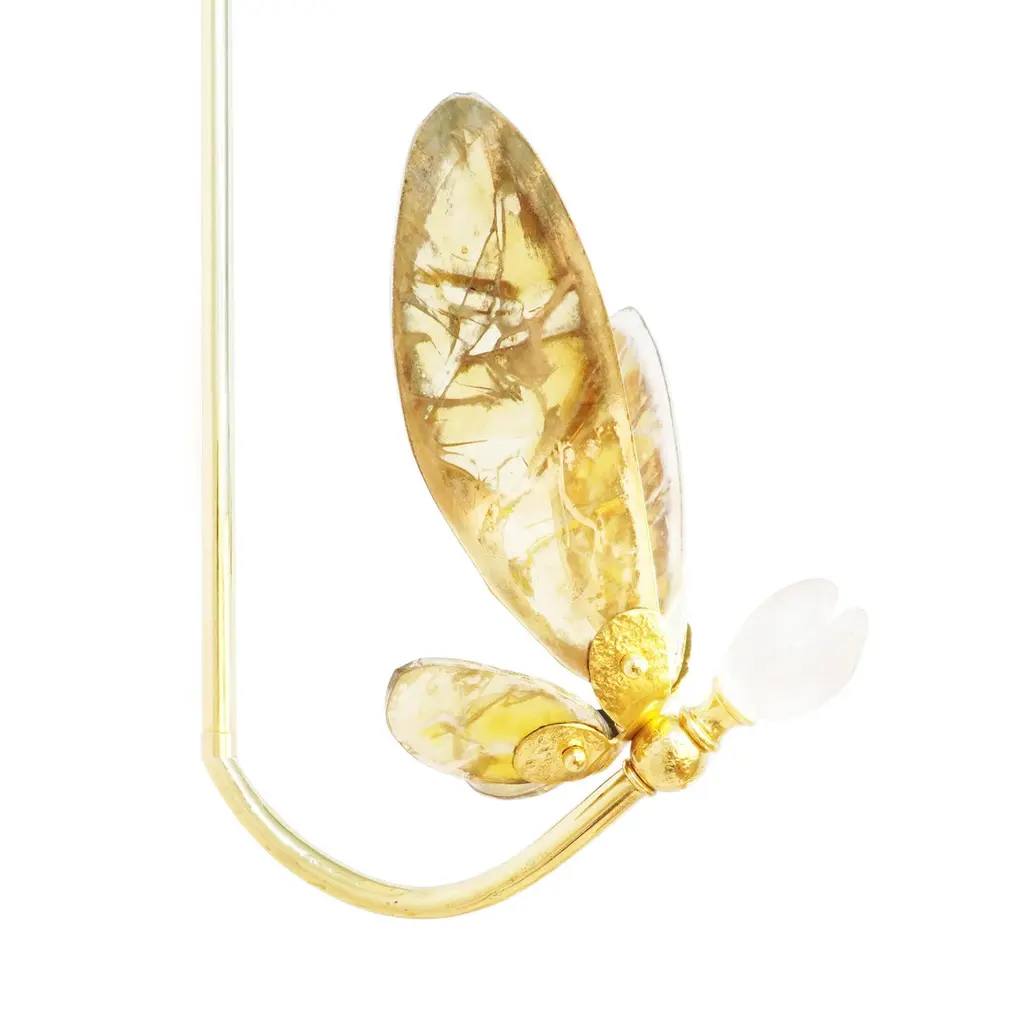 TRILLY the fairy wings of freedomSmall and sophisticated, the Trillies, enterely crafted in Italy, are the little sisters of our Butterfly models, they bring an ethereal allure to your home décor, thanks to their colored and silvered glass wings.A forged brass body, silvered glass wings, the special silver plating treatment, masterfully performed over the years by Sabrina, confers uniqueness to the entire object, as the hallmark of the entire collection.Available in a wide range of silvered glass colors :crystal silvering, jade, rose, sun, black, smoky grey, aquamarine, blue CE certified and Electrified : US, EU, UK , 1x G4 lamp holder, dimmable