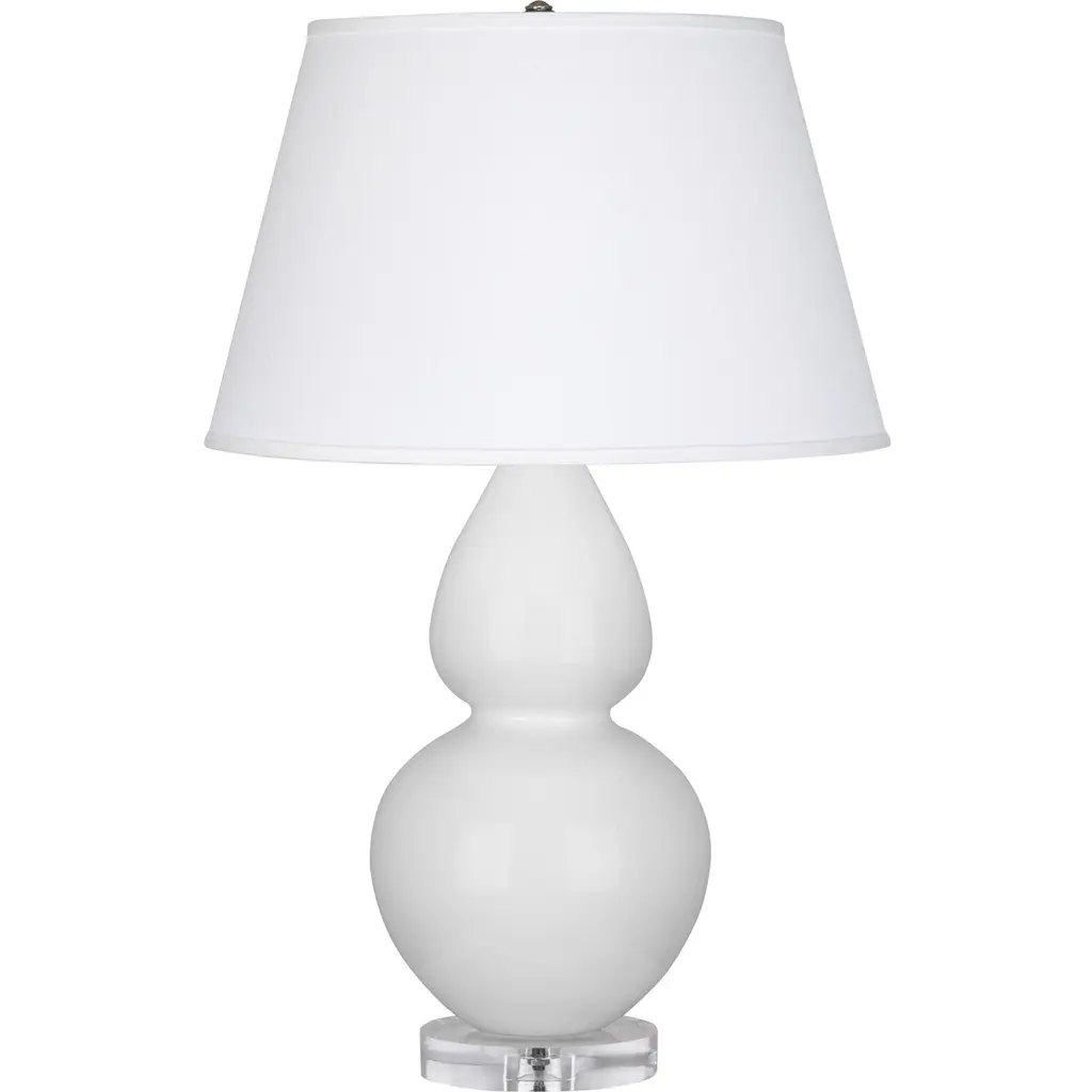 Our Triple Gourd collection features a simple but gracefully curving silhouette. Available in a wide array of vibrant colors and several different base finishes. - Daisy Glazed Ceramic With Lucite Base Triple Gourd Table Lamp With Pearl Dupioni Fabric Shade