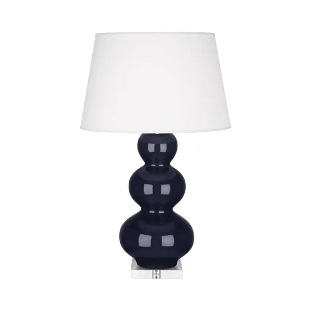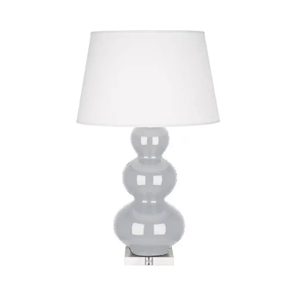 The Robert Abbey Triple Gourd Table Lamp has a beautifully bulbous form accentuated by glossy glazing. The rounded ceramic body is available in a myriad of glaze colors, all of which gleam in the light cast from the Pearl Dupioni fabric shade. The entire lamp appears to float above a table surface on a base of clear lucite.