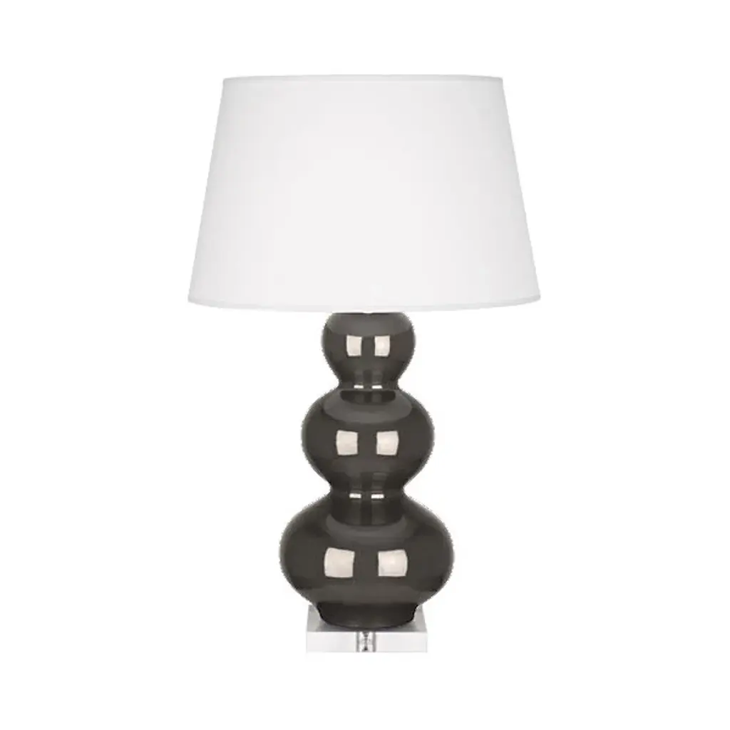 The Robert Abbey Triple Gourd Table Lamp has a beautifully bulbous form accentuated by glossy glazing. The rounded ceramic body is available in a myriad of glaze colors, all of which gleam in the light cast from the Pearl Dupioni fabric shade. The entire lamp appears to float above a table surface on a base of clear lucite.