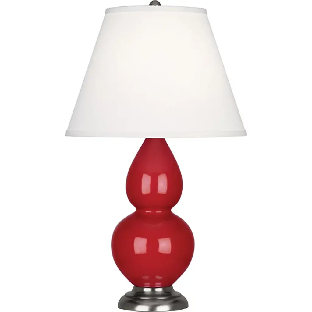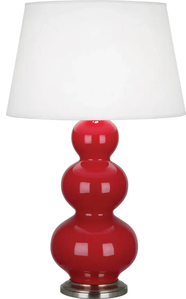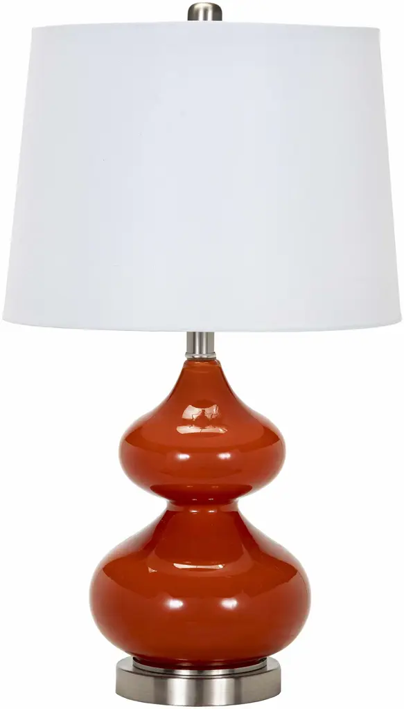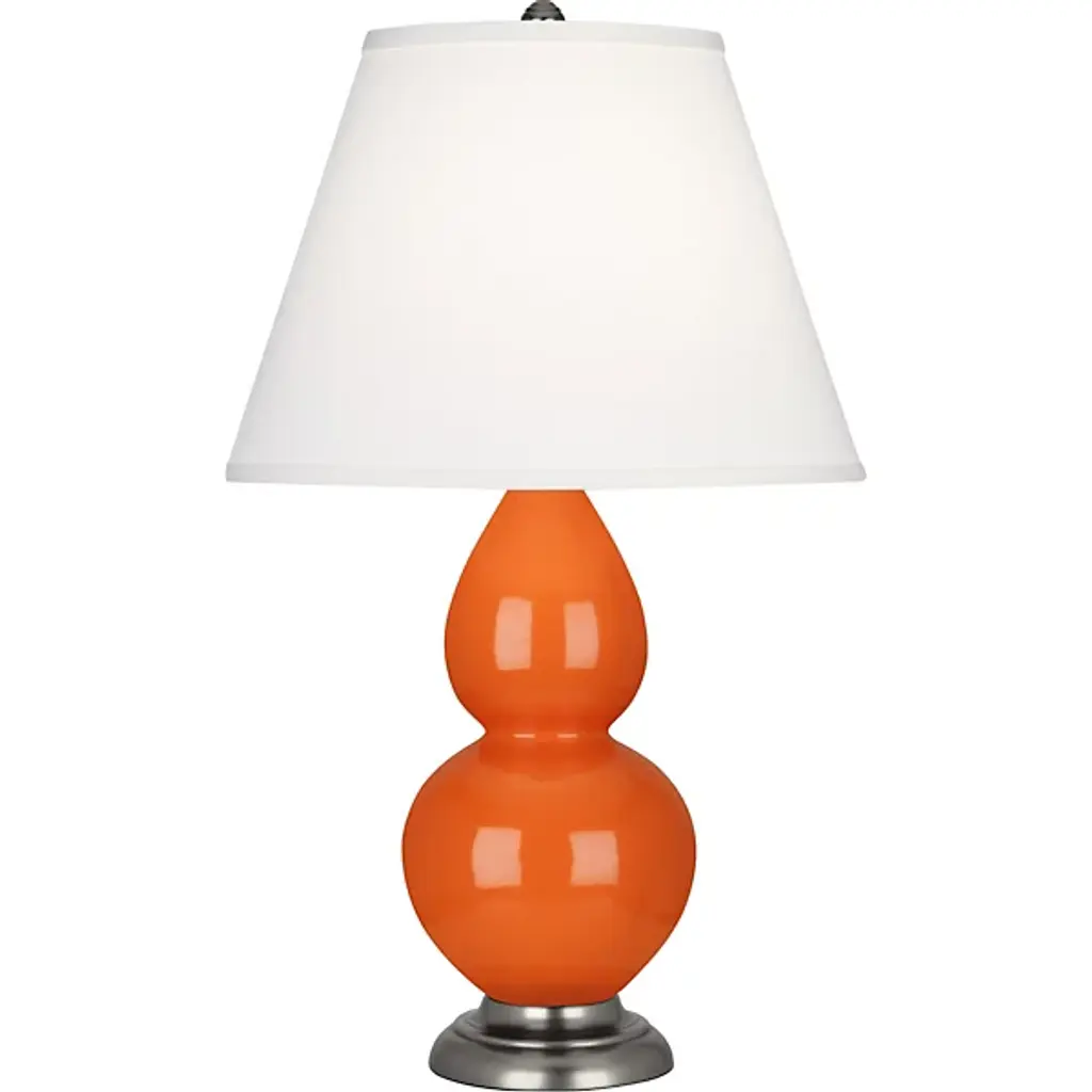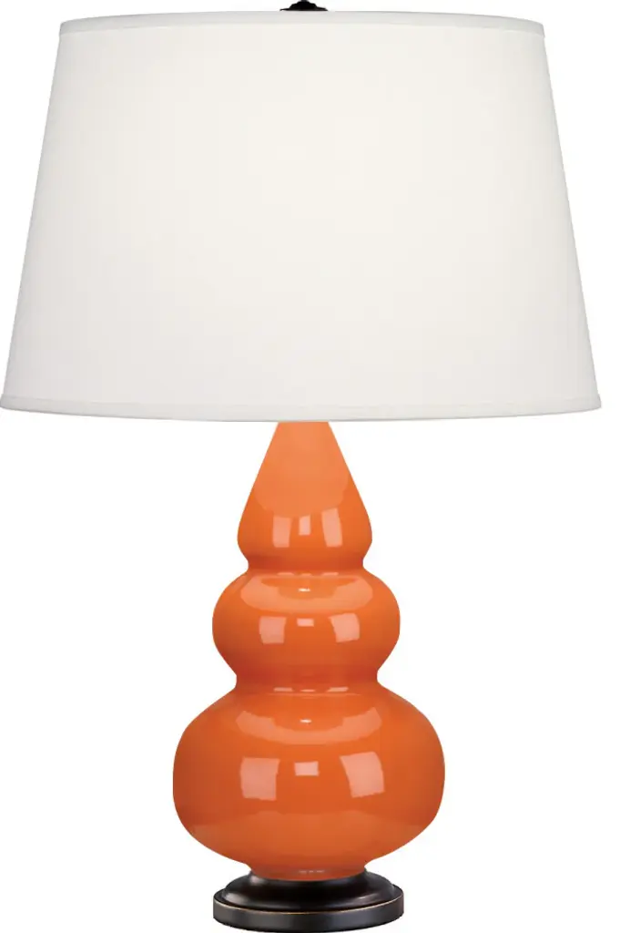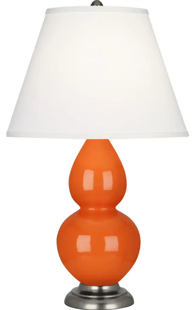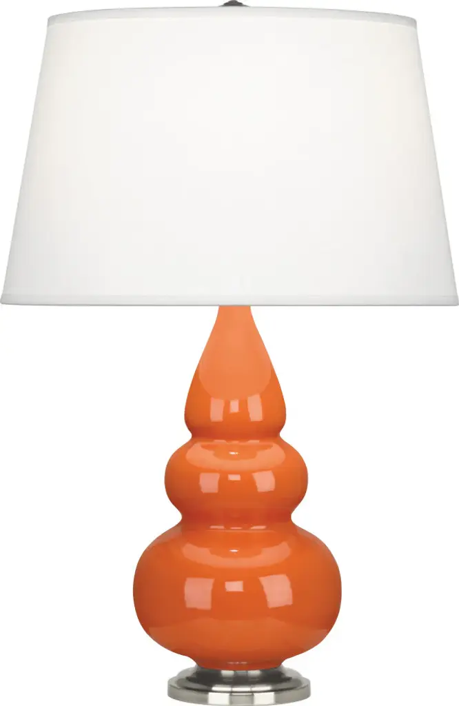 Pumpkin Triple Gourd Contemporary Table LampFeaturesNumber of bulb: 1Bulb type: AMax wattage: 150WVoltage: 120VSocket: Medium E26Switch: 3-Way RotarySwitch location: SocketFinish: Pumpkin Glazed Ceramic with Antique Natural Brass AccentsShade: Pearl Dupioni Fabric ShadeCord color: SilverUL listed: DryDimensionsShade dimensions: 15.5 inches top x 20 inches bottom x 12.5 inches down sideBase dimensions: 2 inches height x 7 inches width x 7 inches depth